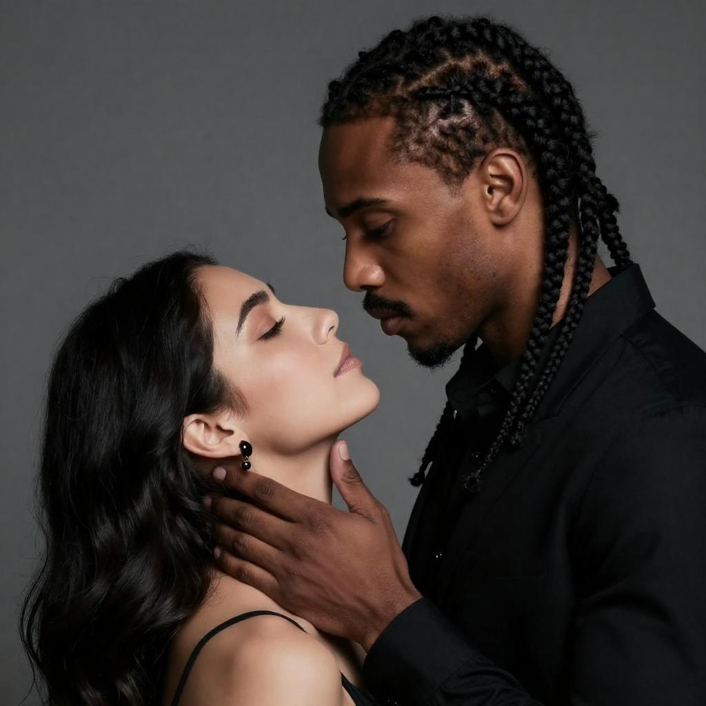 Black and white photograph of two people in tribal attire. A muscular man with a patterned headscarf and vest, intense expression, stands over a woman lying down. She wears a patterned headwrap and looks up at him. He holds her dress. Forest background. Man's right hand grips her chest.