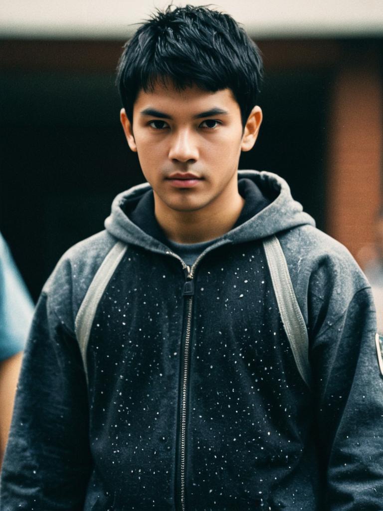Portrait of a young Asian male wearing a blue hooded sweatshirt or costume with white drawstrings and a brown leather belt across his chest. The subject has black hair and is looking directly at the camera with a serious expression, standing against a plain indoor background.