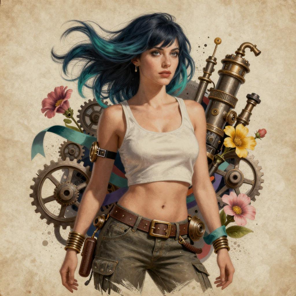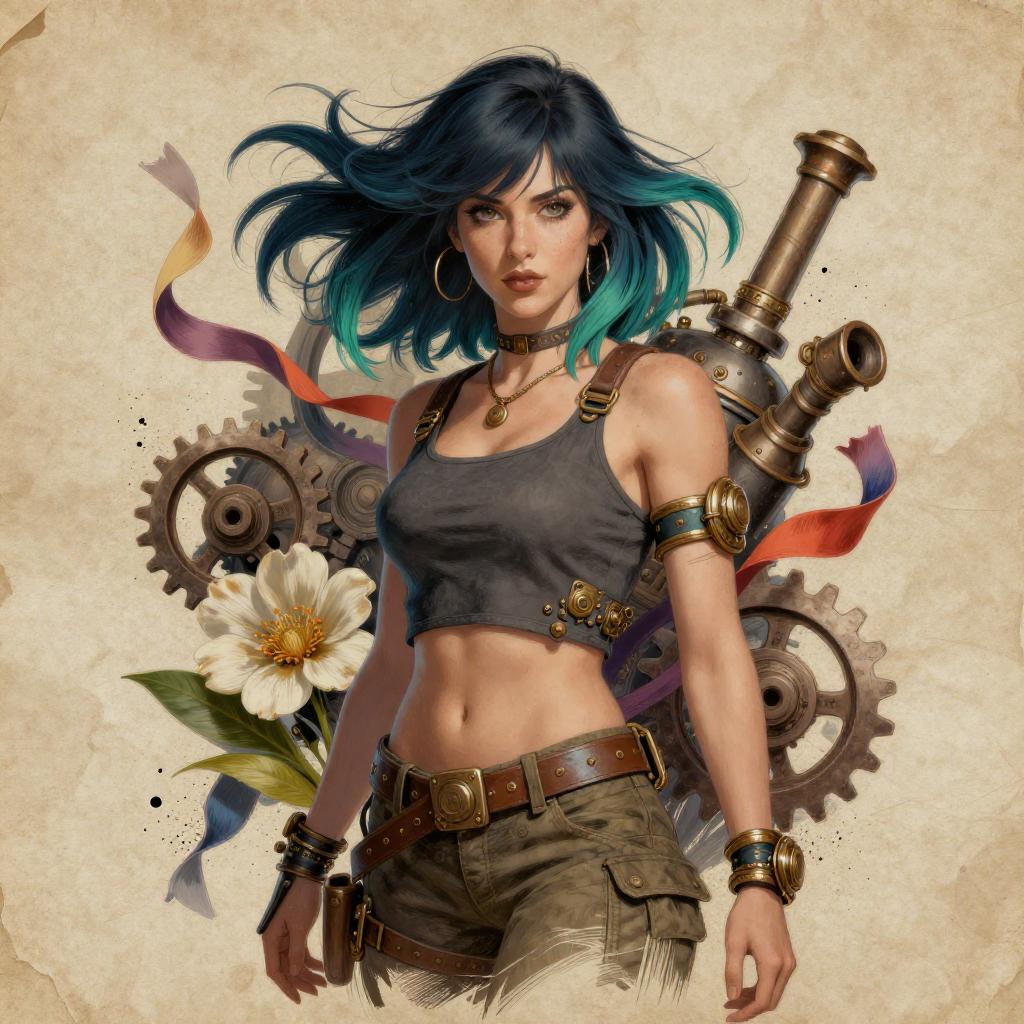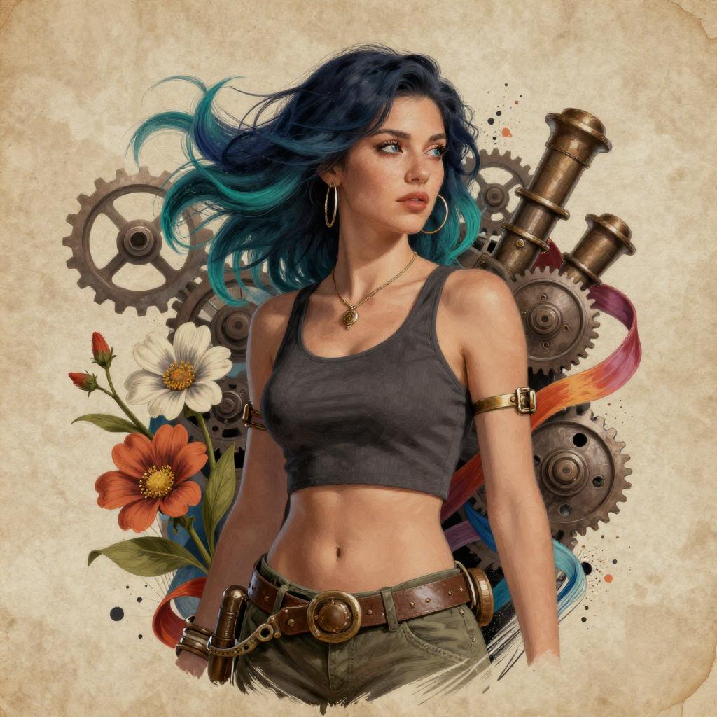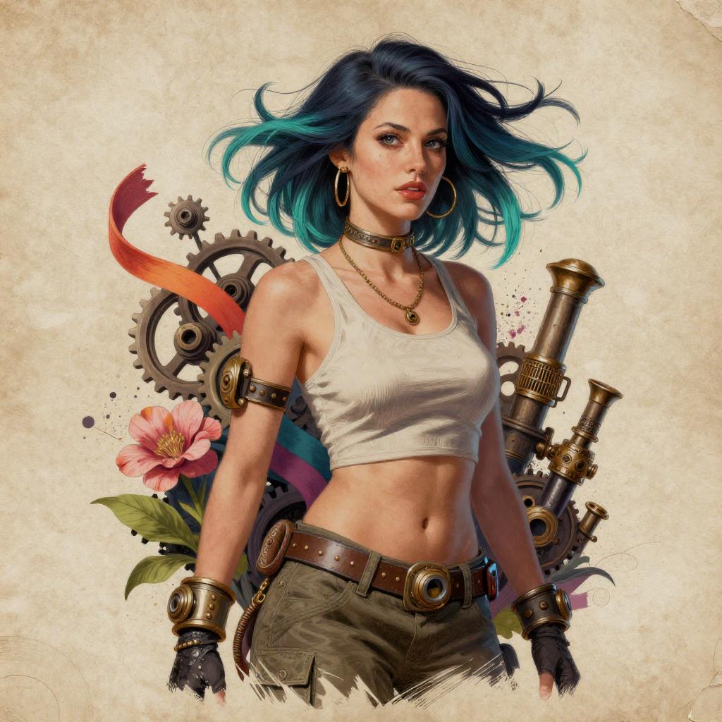 Charlie Bowater realistic Lithography sketch portrait of a woman, flowers, [gears], pipes, dieselpunk, multi-colored ribbons, old paper texture, highly detailed, samdoesartv2, award winning half body portrait of a woman in a croptop and cargo pants with ombre navy blue teal hairstyle with head in motion and hair flying, paint splashes, splatter, outrun, vaporware, shaded flat illustration, digital art, trending on artstation, fine detail, intricate