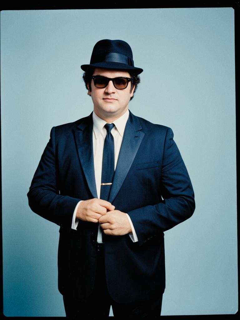 Man in Blues Brothers Fancy Dress costume, photorealistic cosplay studio portrait