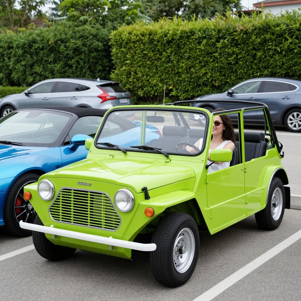 Smiling woman driving a vibrant green classic Mini Moke, parked alongside a sleek blue convertible, with a backdrop of manicured hedges and modern cars in a suburban setting.