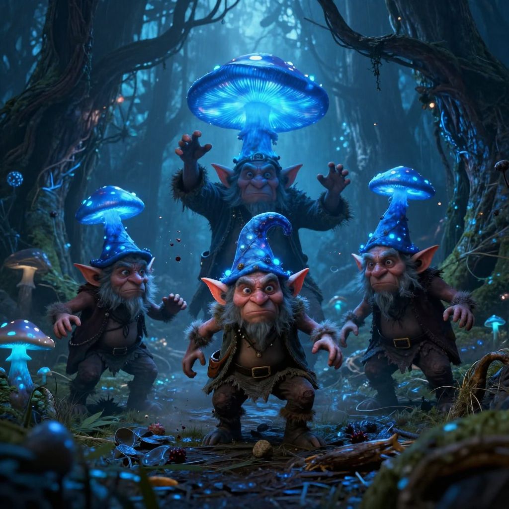 CGI fantasy forest scene: five small, blue-hatted, mushroom-headed goblins with pointed ears and ragged clothes, surrounded by glowing blue mushrooms