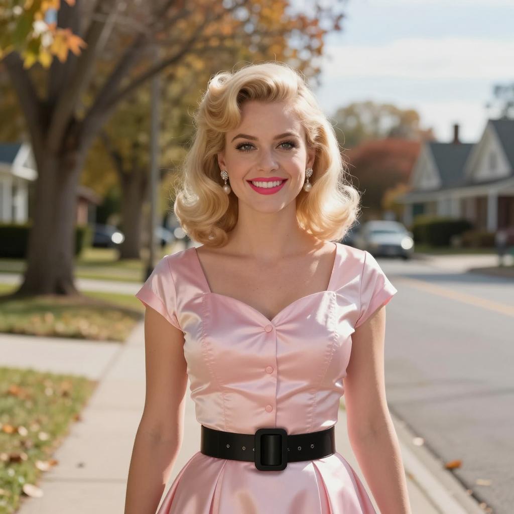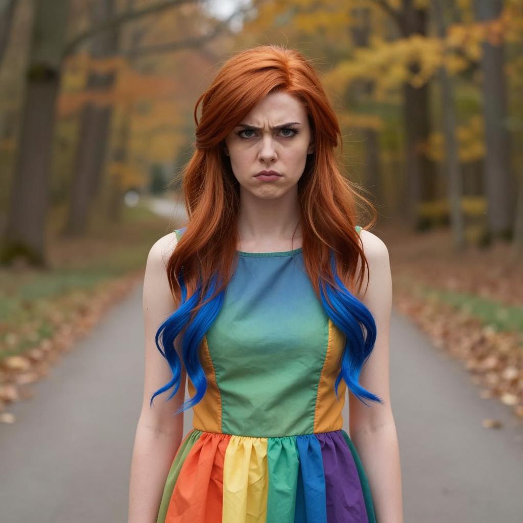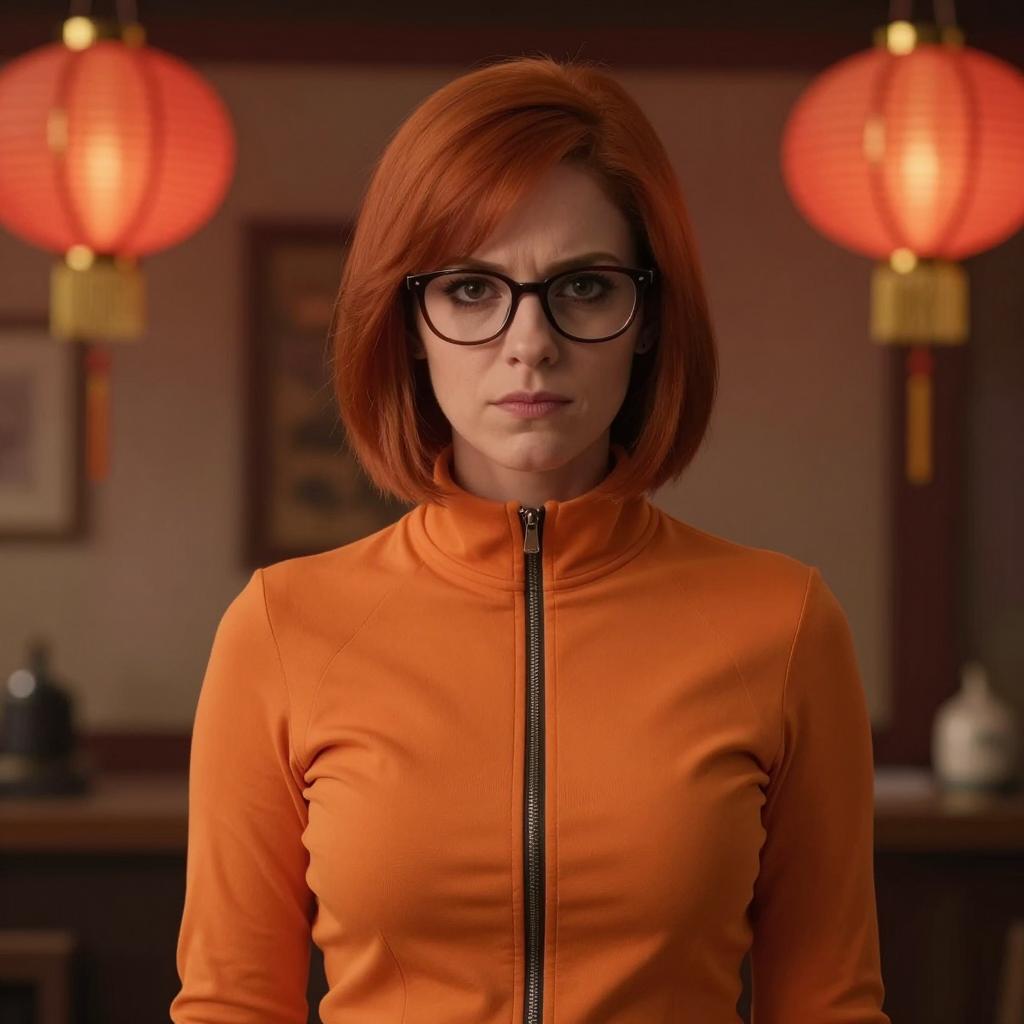 Velma costume movie, photorealistic, reverse-engineered, Veronica Lodge from Riverdale, standing on a sunny street, wearing a green dress with orange collar, orange belt, and orange trim, short red bob haircut, black glasses, white background with blurred pedestrians, trees, and storefronts, daytime, autumn leaves on the ground, direct gaze, slightly serious expression, casual street setting, soft lighting, realistic ures, clear focus on Veronica, slight bokeh effect in the background