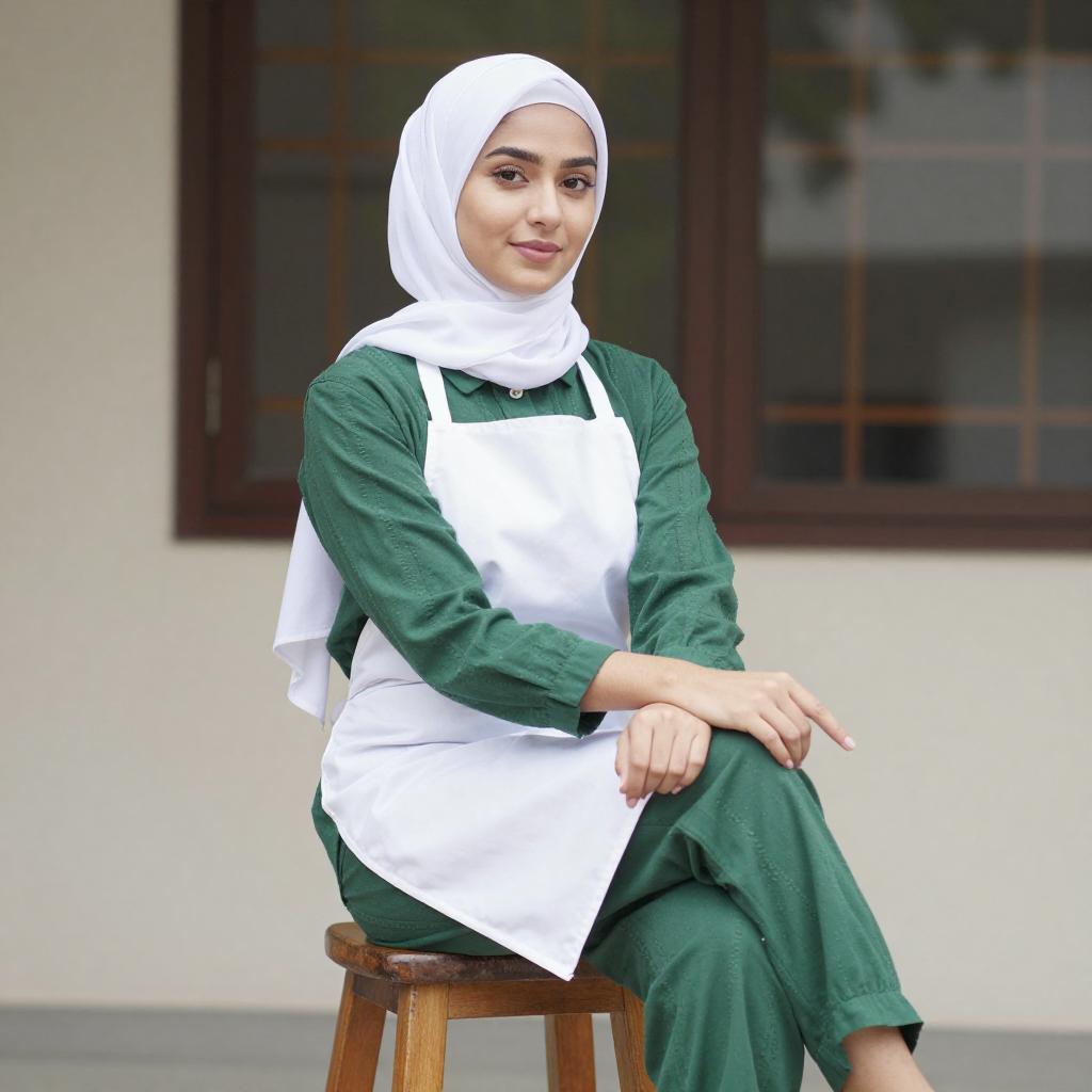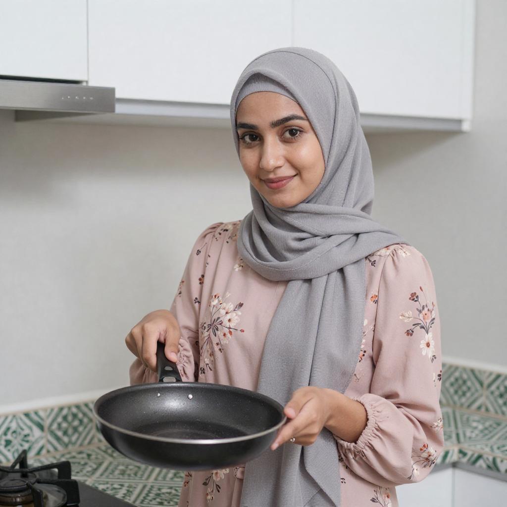 Photograph of a smiling young woman with light brown skin and dark hair, wearing a black hijab and green satin skirt, standing in a small, cluttered kitchen. She is washing dishes at a sink, with shelves and kitchen utensils visible in the background. Warm orange walls and a refrigerator are also present.
