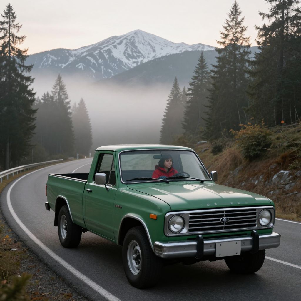 A vintage green pickup truck driving along a winding mountain road during early morning fog, with mist rolling over pine forests and snow-capped peaks in the distance; the driver is a young woman with short brown hair and a red jacket, wearing gloves and focused on the road.