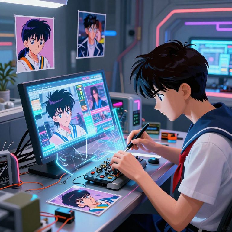 Anime fix photos, an imaginative futuristic workshop where anime characters repair and fix nostalgic anime photos using advanced holographic devices, bright neon colors, intricate details, dynamic composition, ultra-realistic textures