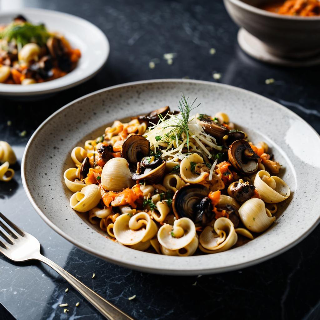 Close-up of a bowl of orecchiette pasta served with sautéed mushrooms, diced carrot and fennel, shaved parmesan cheese, and fresh dill garnish. The dish is presented on a sleek black marble countertop with natural morning light highlighting the creamy texture and vibrant ingredients.