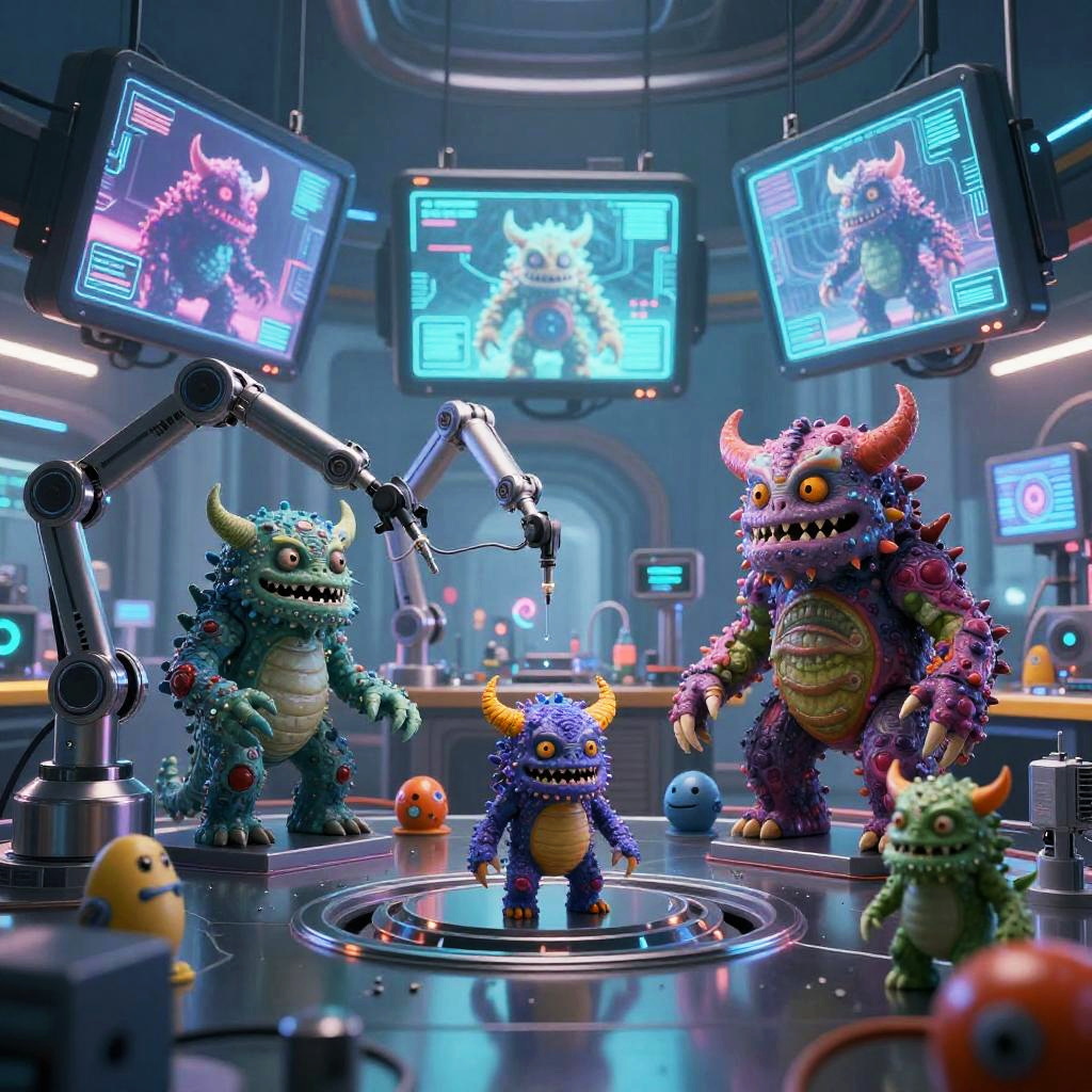 Monster generator AI, surreal and futuristic laboratory filled with glowing screens and robotic arms crafting bizarre and colorful monsters, neon lights reflecting off metallic surfaces, intricate details, digital art style, vivid colors, high-tech atmosphere