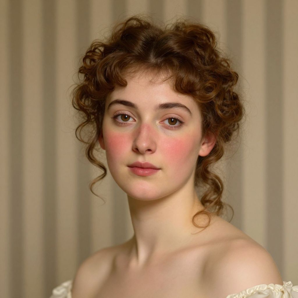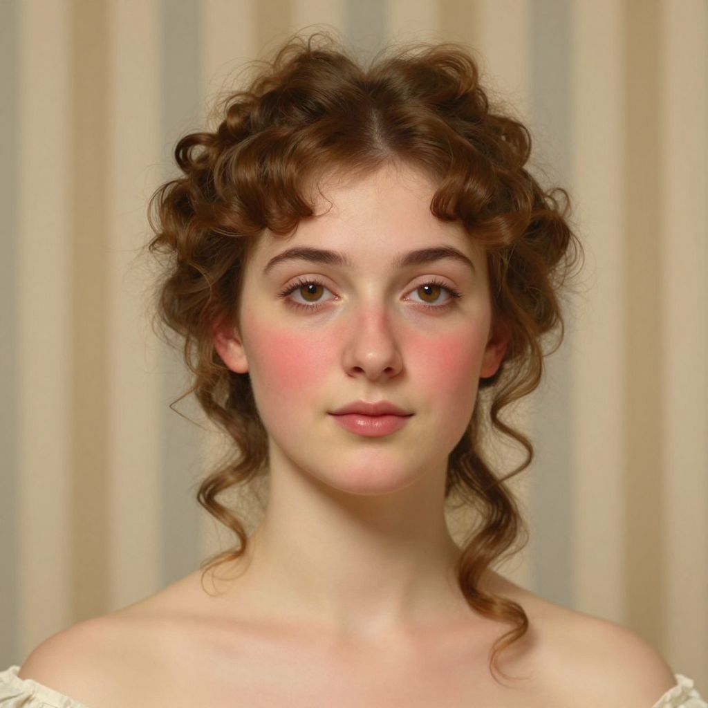 Photograph of a young woman with fair skin and rosy cheeks, centered against a striped beige and cream background. She has curly, brown hair styled in loose ringlets framing her face. Her eyes are brown, and she has a slight, neutral expression with a closed mouth. She wears an off-the-shoulder white garment, revealing her collarbones. The image has a soft, slightly vintage feel, with subtle lighting highlighting her facial features. The overall composition is simple, focusing on her facial expression and hairstyle.