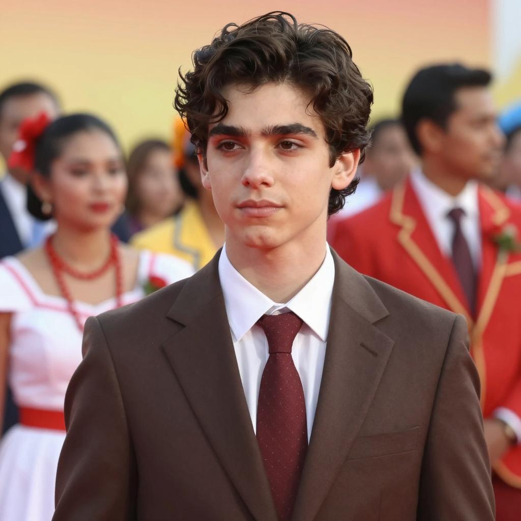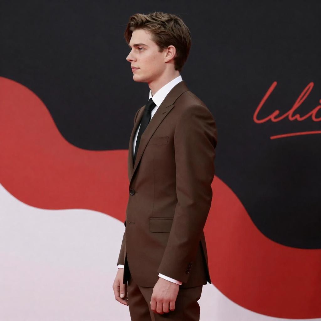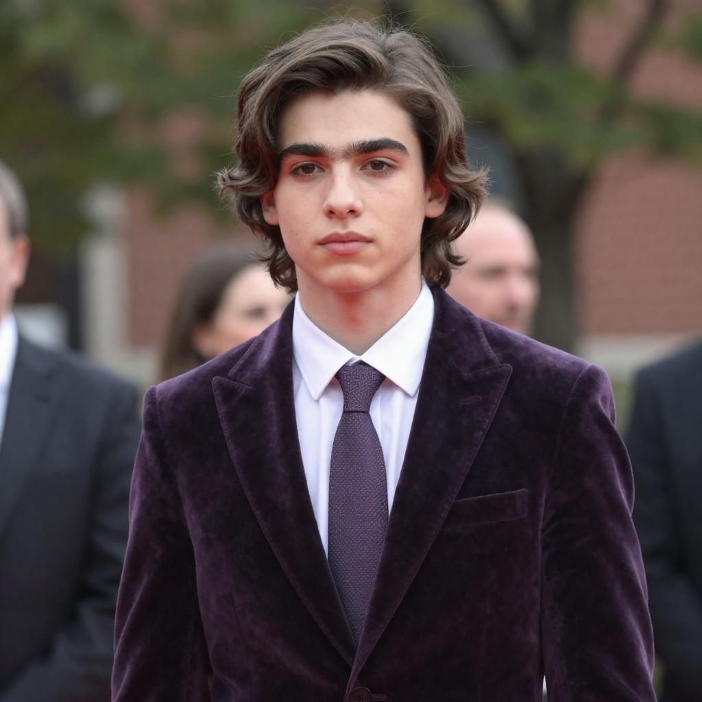 Young man with shoulder-length brown hair, wearing a dark purple velvet blazer, white shirt, and patterned tie, looks forward. Background: green trees, blurred people, brick building. One person partially visible on left, another in background. Natural light.