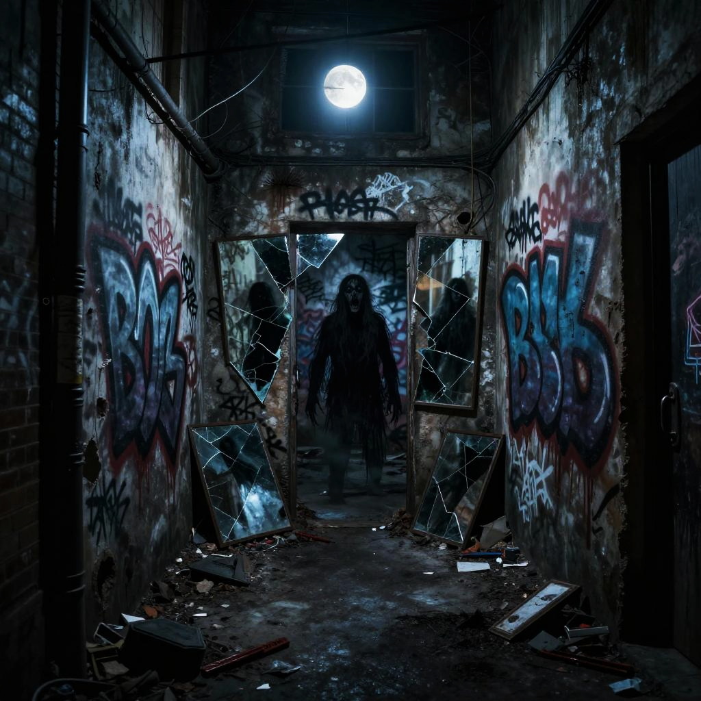 Cursed image scary urban alleyway with distorted, grimy graffiti walls, scattered debris and broken mirrors reflecting twisted, shadowy figures, cold moonlight illuminating ominous shapes, high detail, unsettling atmosphere, psychological horror.