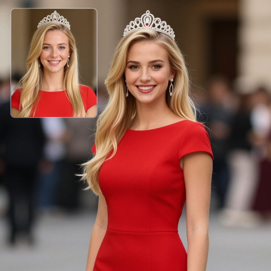 Red birthday dress, 1girl, dress, blonde hair, solo, red dress, realistic, reference inset, tiara, long hair, smile, looking at viewer, crown, photo inset, short sleeves, jewelry, earrings, blurry background, blurry