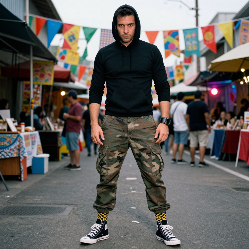 A man, camo print cargo pants, fitted black hoodie, high-top canvas sneakers, bold patterned socks, leather wristband, vibrant street stalls, colorful banners fluttering, lively music echoing, kodacolor analog film, confident expression.Man has masculine face and piercing eyes