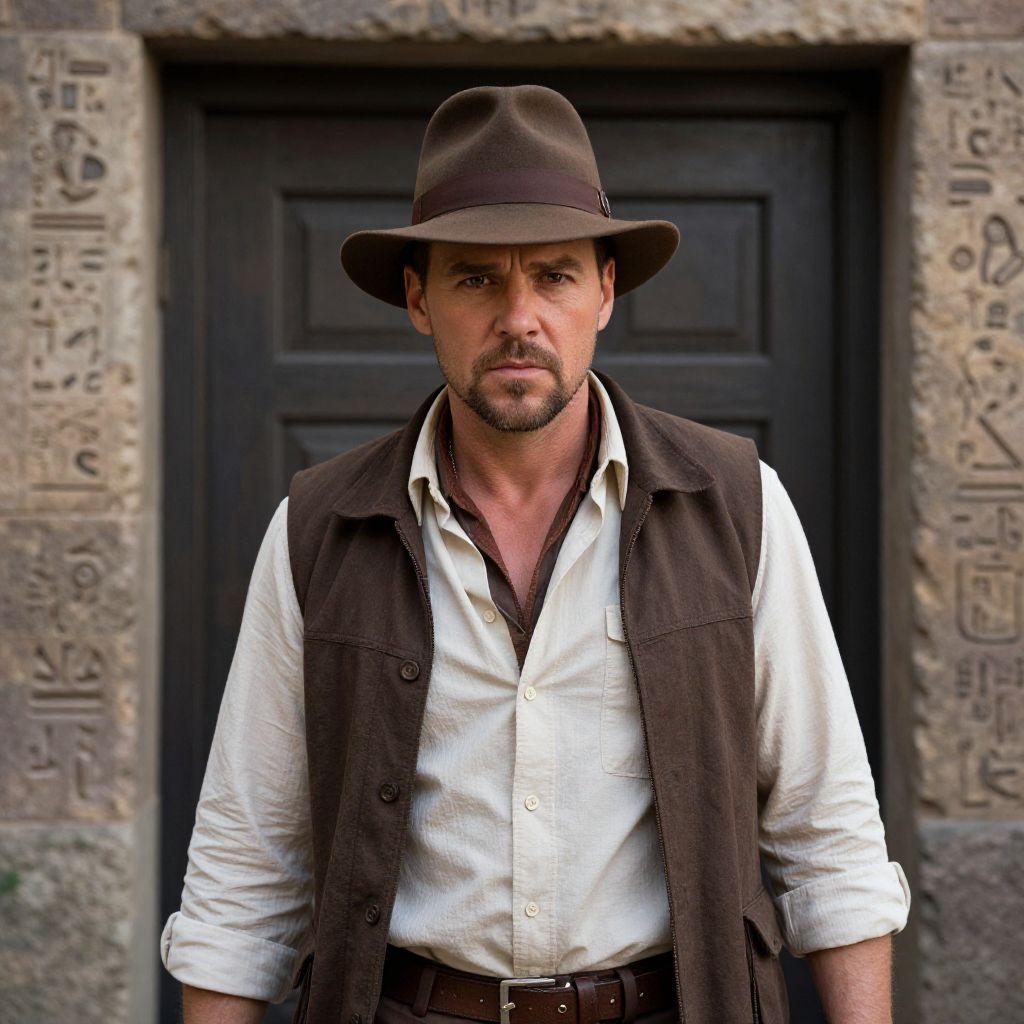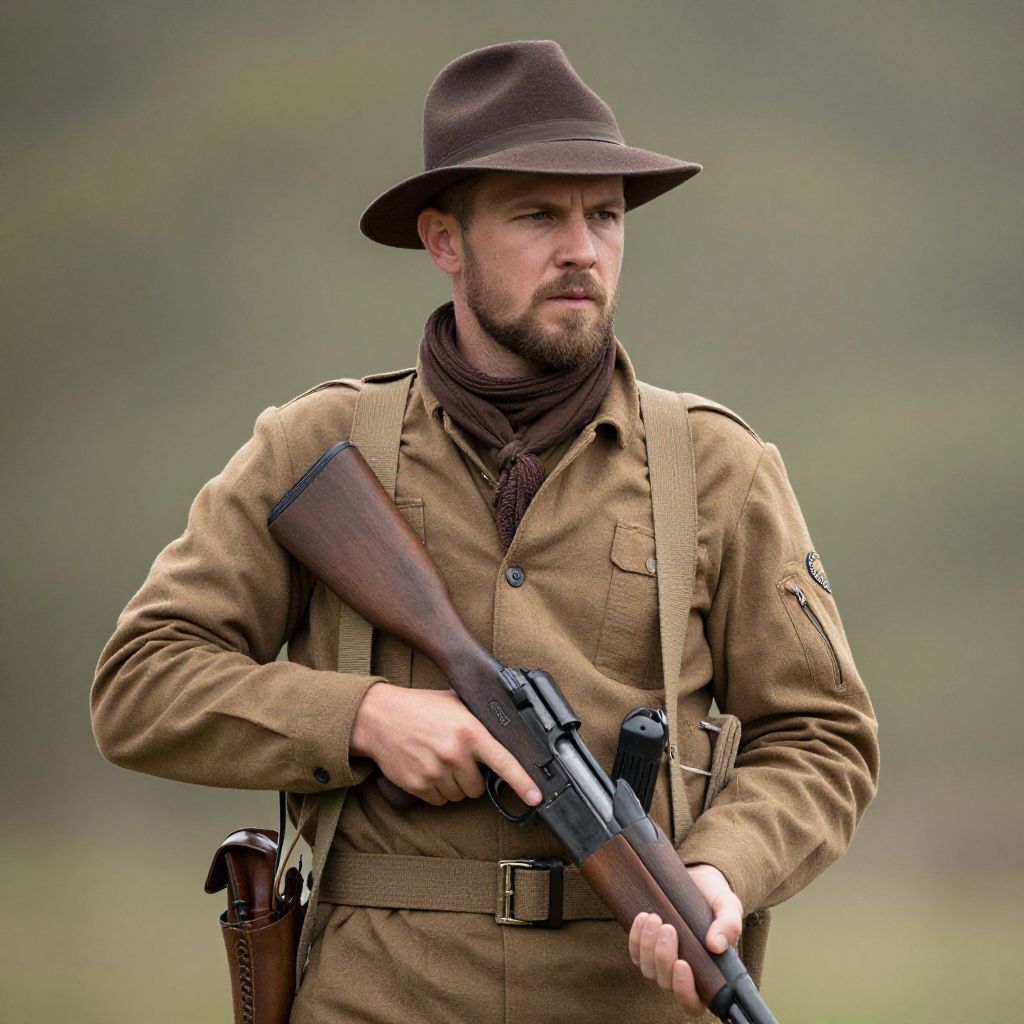 A man with a beard and mustache is wearing a brown outfit with a brown hat and a brown scarf around his neck. He is holding a rifle in his right hand and has a gun in his left hand.