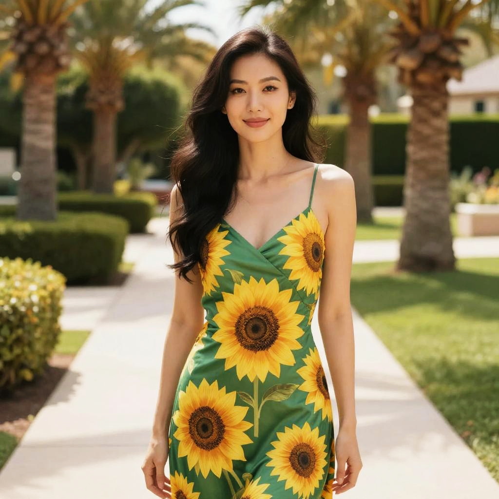 Photograph of an Asian woman with long, wavy black hair standing outdoors on a sunlit pathway lined with palm trees and manicured bushes. She wears a sleeveless, V-neck green dress adorned with large, bright yellow sunflowers. Her skin is light, and she has a subtle smile. The background is slightly blurred, highlighting the pathway and greenery. The image has a soft, slightly enhanced color palette, giving it a vibrant, summery feel. The woman stands centered in the frame, her dress flowing gently in the light breeze.