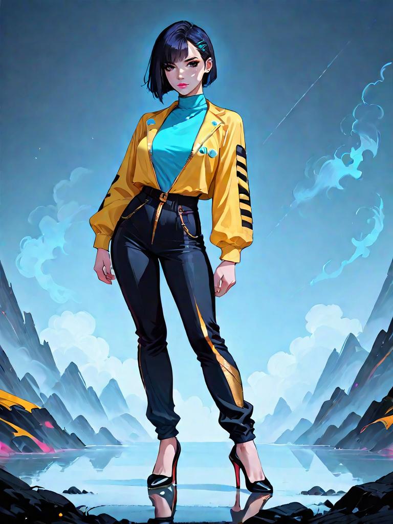 Digital art of a confident young woman standing in a reflective water surface against a mountainous misty background. She wears a yellow cropped jacket with black stripes on the sleeves, a turquoise high-neck top, and sleek black high-waisted pants with gold zipper details. Her outfit combines minimalist and modern elements, paired with black high-heeled stilettos. The scene is set in a dark fantasy nighttime environment with fog and night mist.