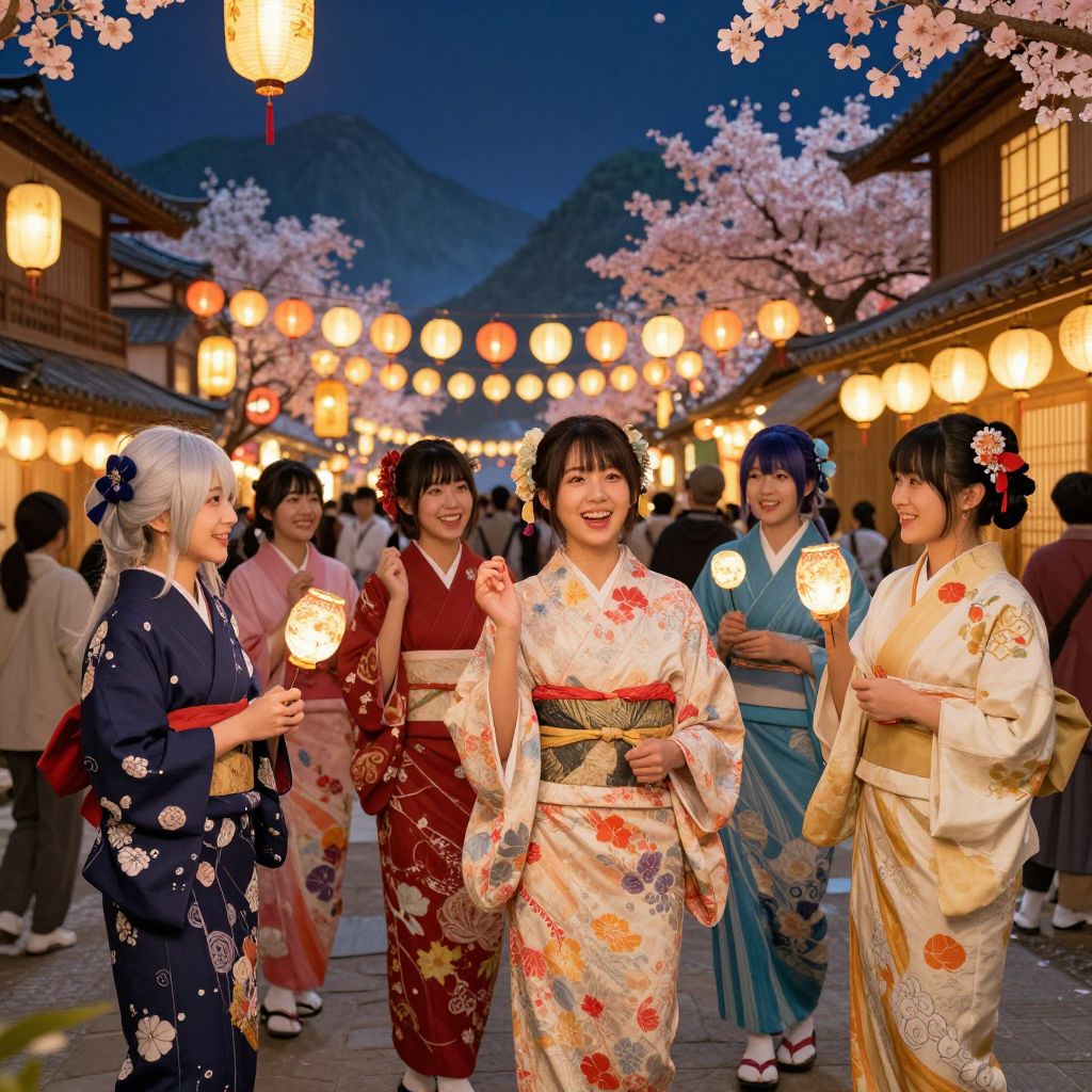 Genshin women characters enjoying a festival in a traditional village, vibrant lanterns and decorations, detailed kimonos and accessories, joyful expressions, warm glowing lights, intricate background with mountains and cherry blossoms, rich color palette, lively scene.