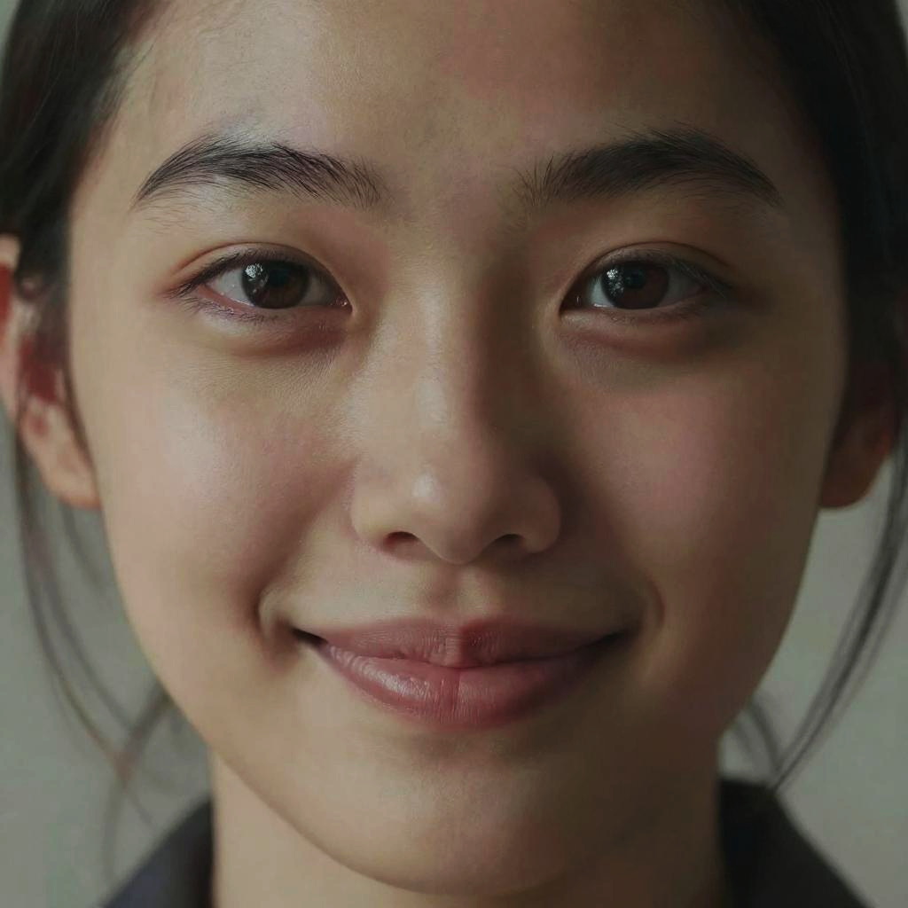 Photograph of an East Asian woman with wet, straight black hair, smiling softly. She has a fair complexion and is wearing a white, translucent, wet T-shirt that clings to her body, revealing the outline of her breasts. Water droplets are visible on her face and shirt. The background is blurred, featuring dark green and gray hues, suggesting an outdoor, possibly forested, setting. The lighting is natural, highlighting her gentle expression and the texture of her wet clothing.