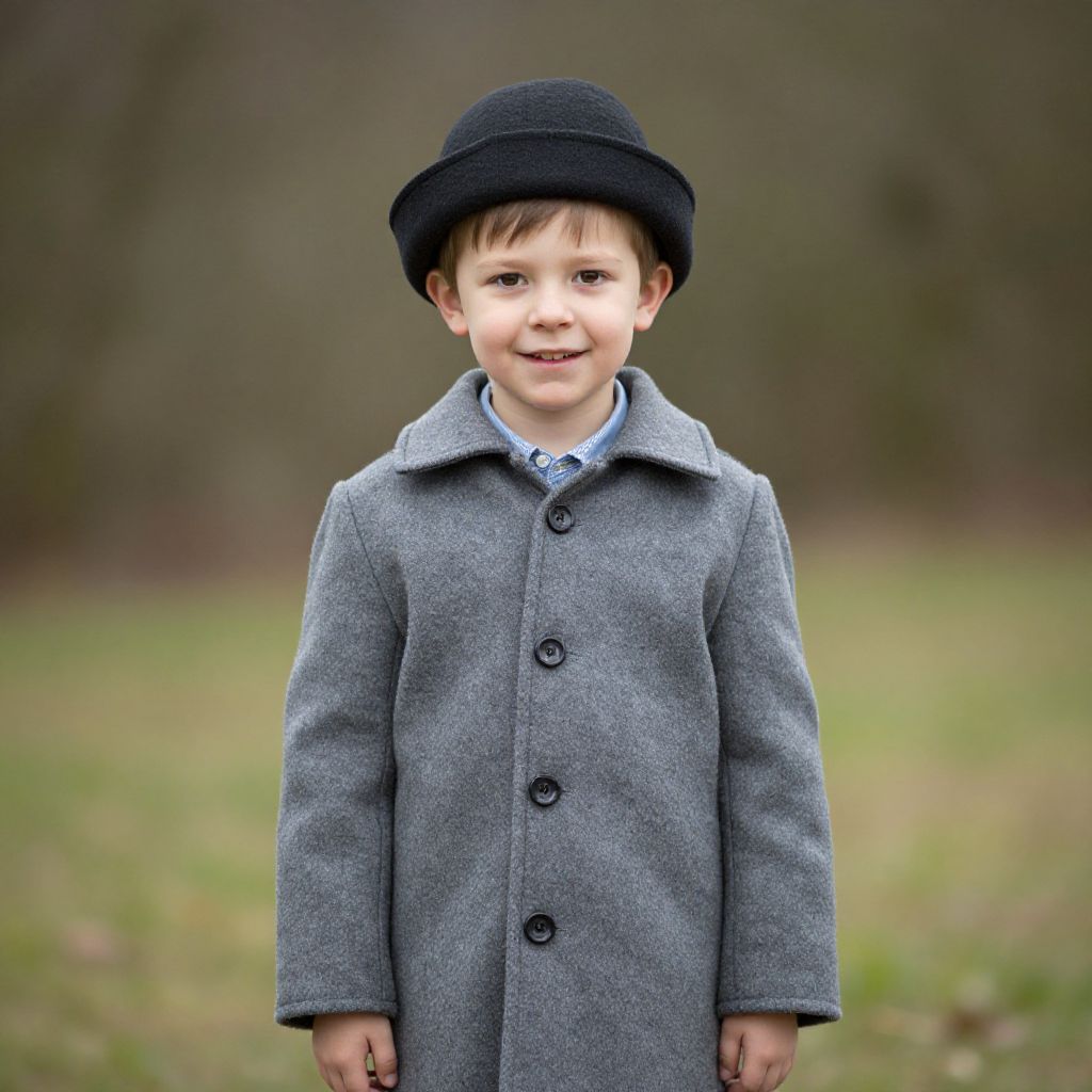 "Wordle Costume, young boy wearing a coat and a hat"