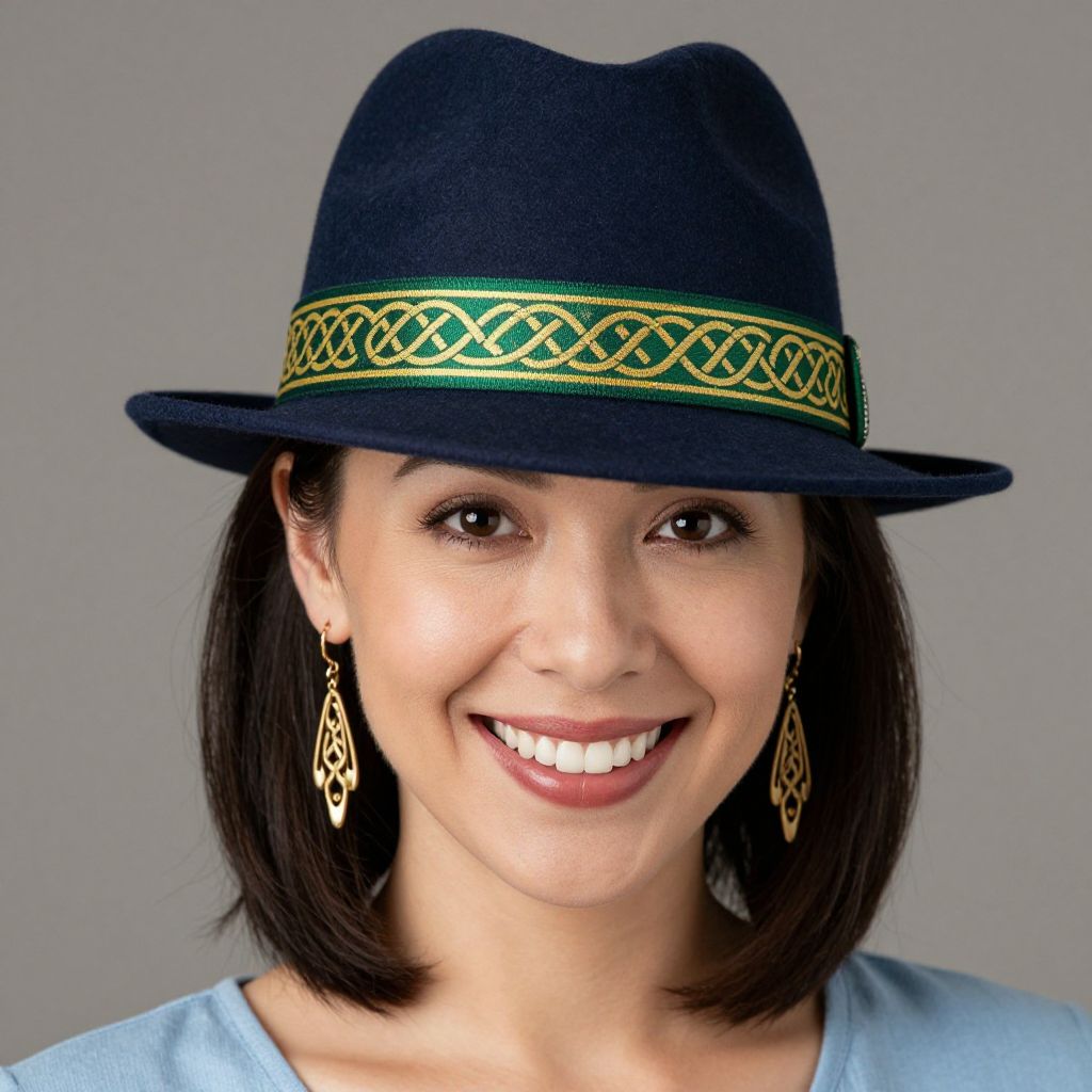 Smiling woman wearing a navy fedora hat adorned with a vibrant green and gold band featuring intricate Celtic knot patterns, complemented by dangling gold earrings and a light blue top against a neutral background.