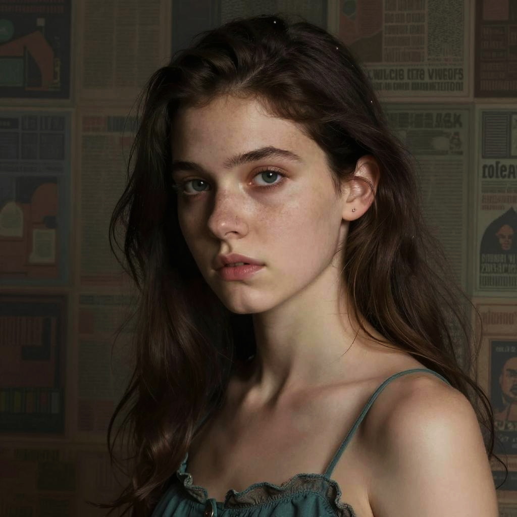 Photograph of a young Caucasian woman with fair skin and long, wavy dark brown hair. She has striking blue eyes, small nose, and subtle freckles across her cheeks. She is wearing a green, lacy spaghetti strap top that reveals her slender shoulders. The background is filled with old, worn-out newspaper clippings pinned to a wall, adding a vintage, slightly gritty atmosphere. The lighting is soft, highlighting her face while casting gentle shadows. Her expression is neutral, slightly melancholic, and her gaze is directed towards the camera, creating an intimate, contemplative mood.