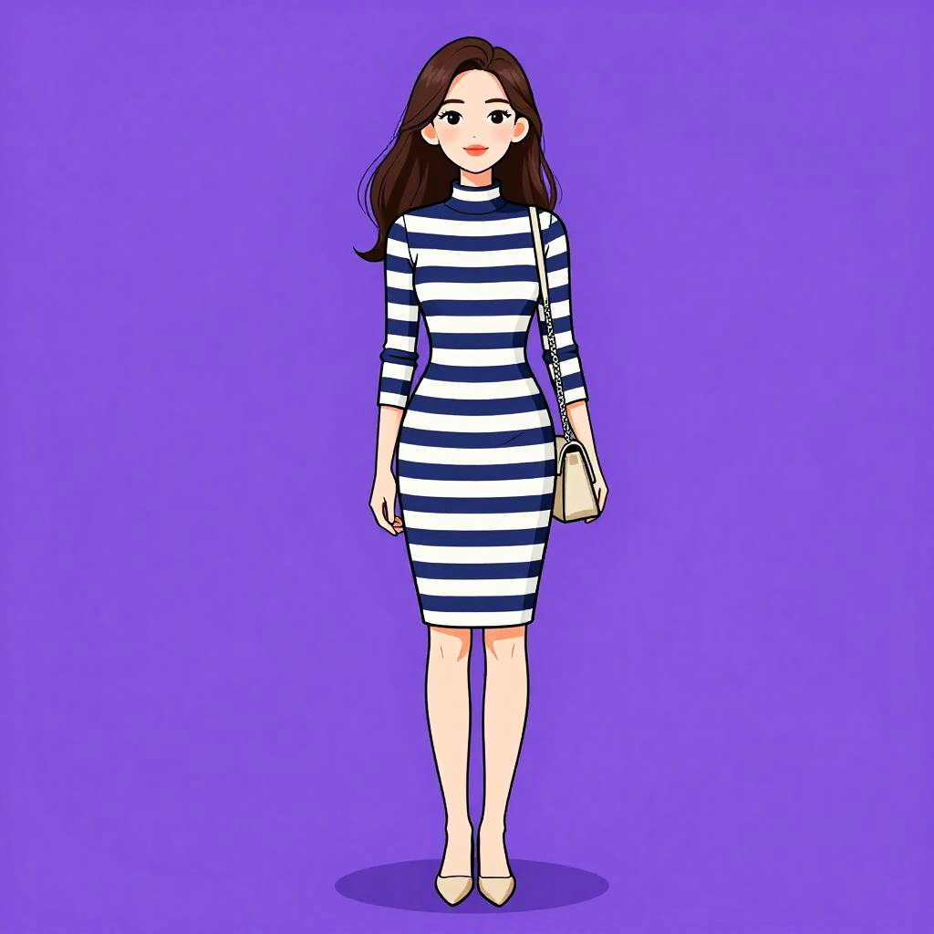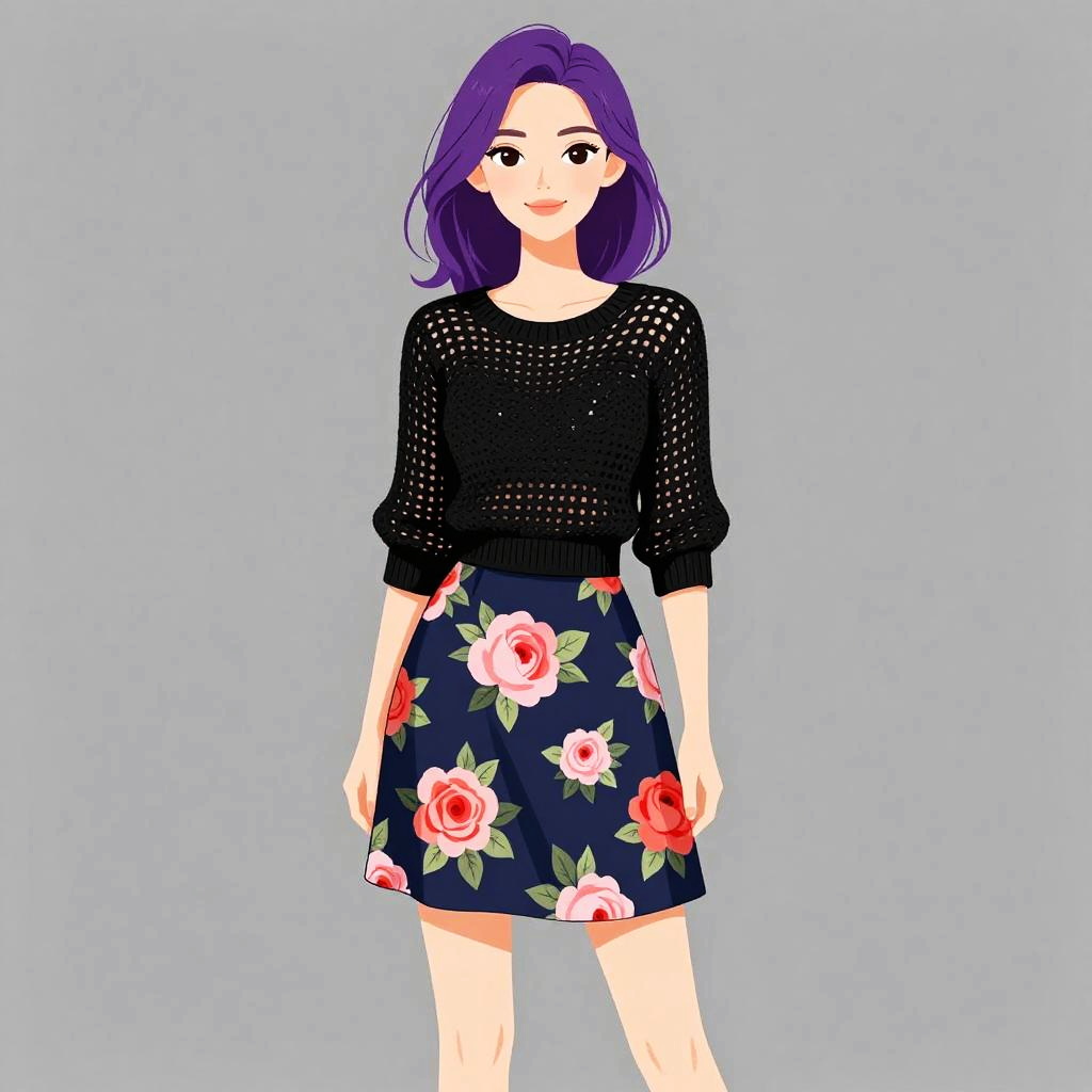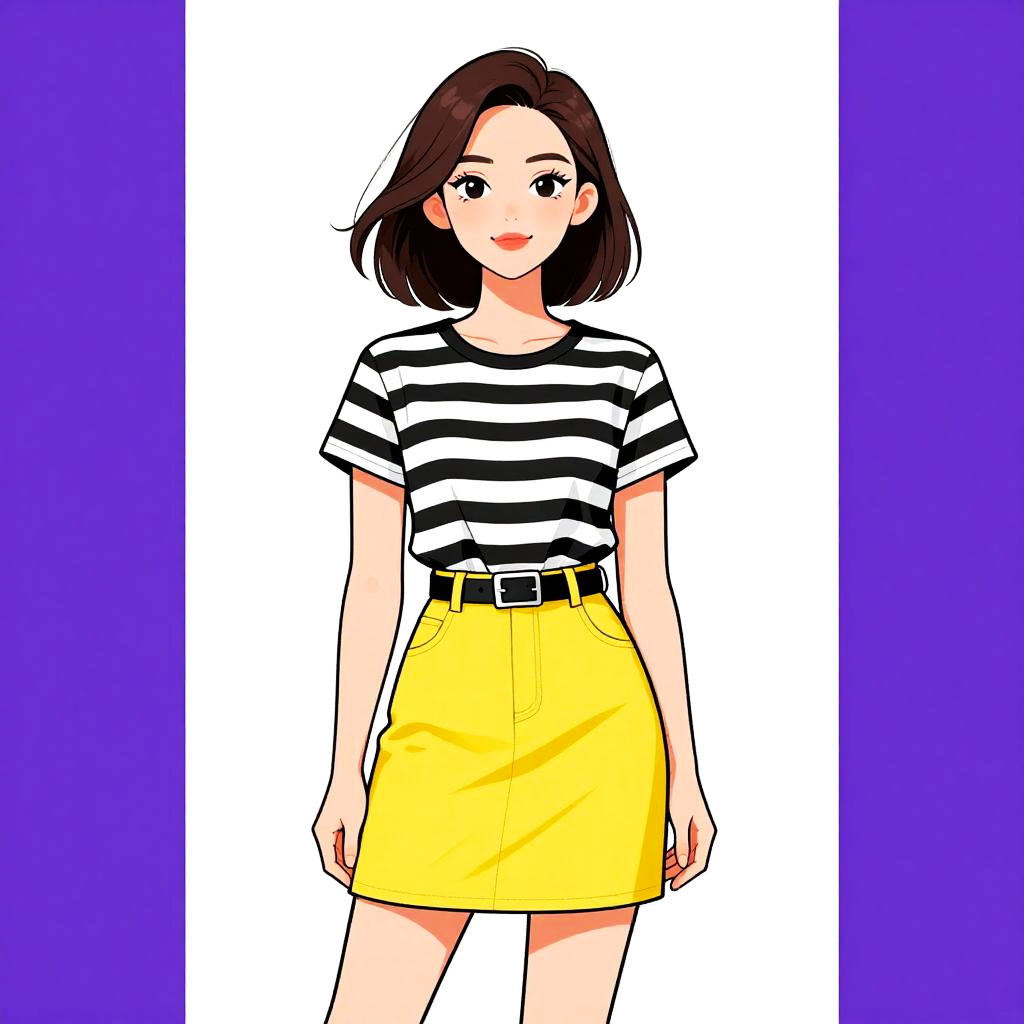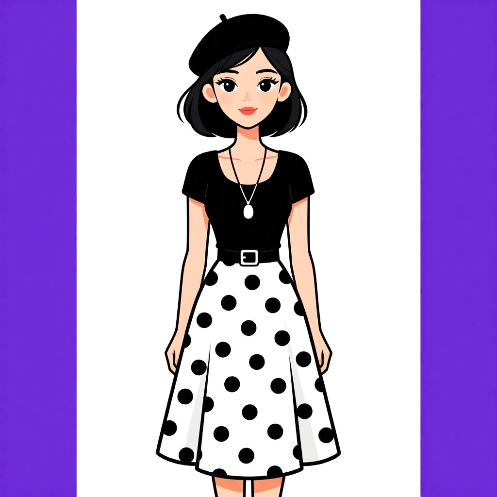 Woman with pretty face and pretty hair. Woman, contemporary with a vintage twist, black short-sleeve top, scoop neckline, paired with a high-waisted white skirt featuring large black polka dots, flared silhouette, above-knee length, thin black belt with a small buckle, long pendant necklace, black beret, white background. --sref 1467
