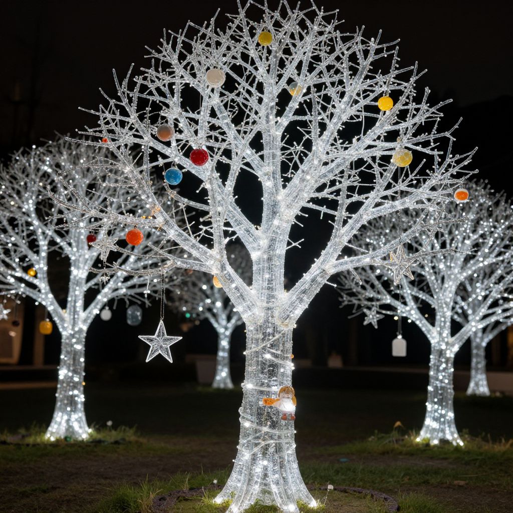 Photograph of glowing, white, leafless trees adorned with colorful Christmas ornaments, illuminated against a dark night background.