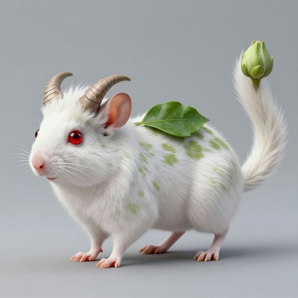 1 animal, ((small rodent body)), ((beak)), ((no ears)), short legs, tiny legs, tiny claws, quadruped, ((horns)), ((white skin, light green spots, light green variegation)), leaf mane running along back, red eyes, red sclera, white mane, ((club-tipped tail, flowerbud-tipped tail)), (semi-realistic, high quality, best quality), variety