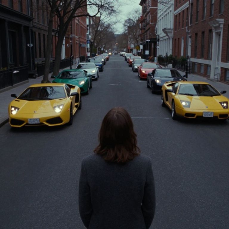 Wes Anderson a scene looking out at an empty city street with a line of lamborginis of different colors approaching from the background in the style of a dark horse comic,