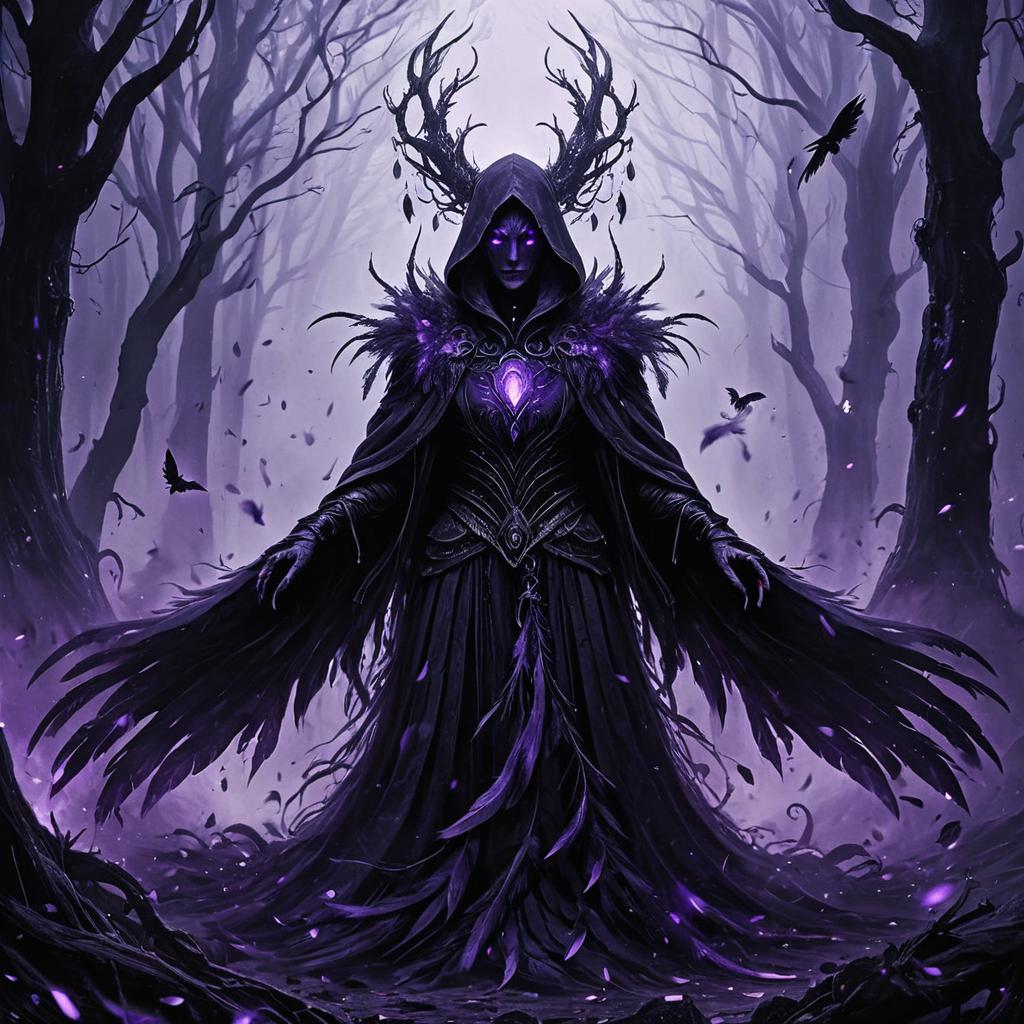 Dark fantasy digital art of a mystical shadow wraith with a translucent smoky form and glowing violet eyes. The figure is cloaked in flowing black and purple garments with feather-like elements and antler-shaped branches emerging from its hood. Set within a fog-laden, eerie forest filled with drifting black feathers and scattered amethysts, creating an ethereal and haunting atmosphere.