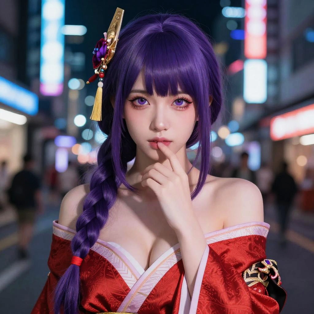 Digital art of a beautiful anime-style woman with purple hair, red kimono, and tassel hairpin, in a neon-lit city street.