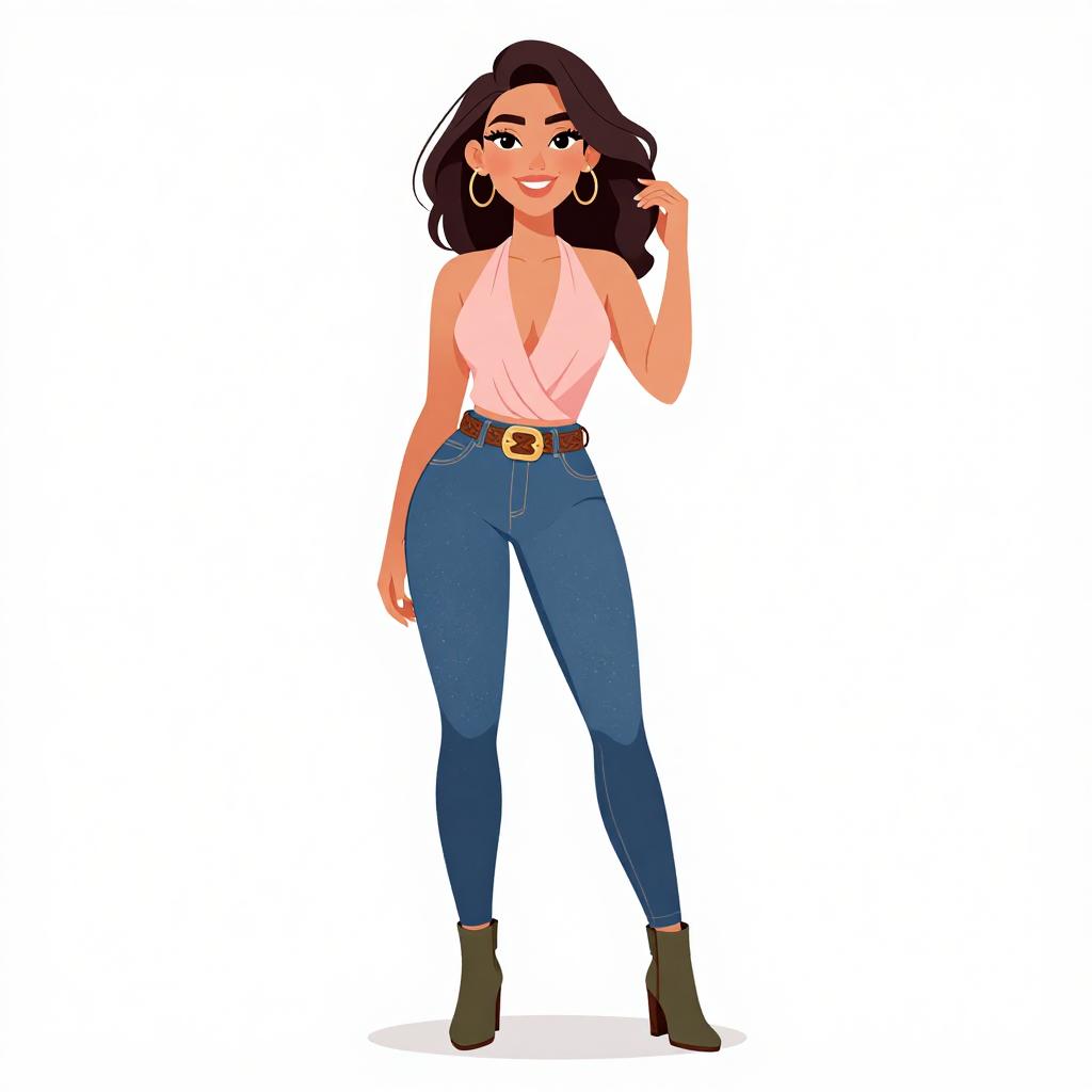 Woman with pretty face and pretty hair. smiling Woman, modern chic, sleeveless white top with cut-out sides and laced-up detailing in gold, high-waisted black flared trousers with drawstring, open-toe black heels, minimalist style, plain white studio background. --sref 1467