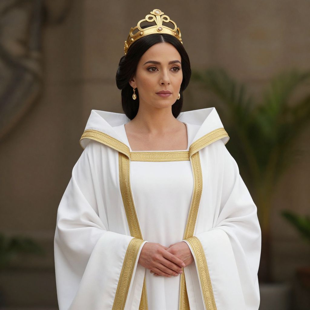 Photograph of a woman with fair skin, black hair, and dark eyes, wearing a gold crown and a white, ornate robe with gold trim. She has a calm expression, is standing with her hands clasped in front of her, and is adorned with small gold earrings. The background is slightly blurred, featuring a stone wall and a green plant. The woman's robe has a regal, historical appearance, and the crown has intricate, metallic detailing. The overall style suggests a religious or royal ceremony.