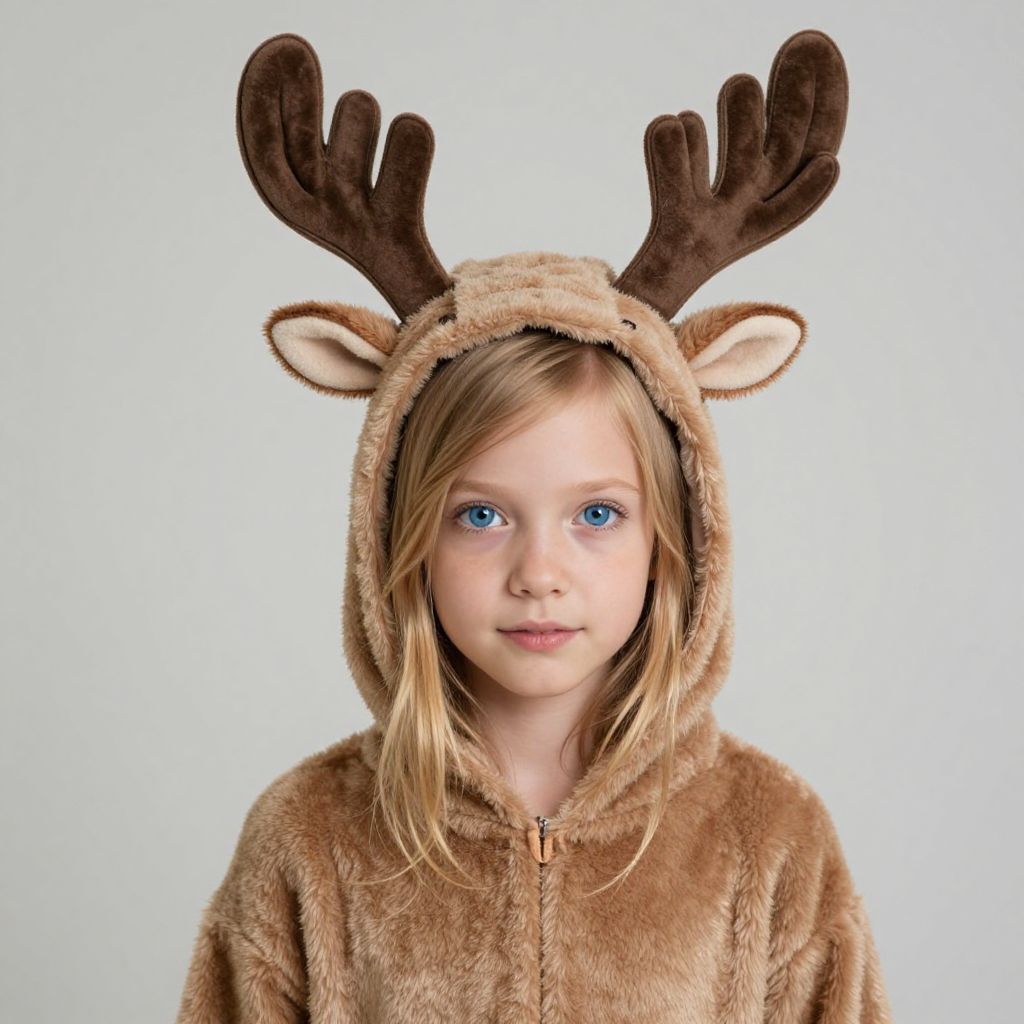 "childs realistic deer, solo, animal costume, blue eyes, 1girl, antlers, kigurumi, reindeer costume, blonde hair, looking at viewer, horns, reindeer antlers Realistic photo of casual sexy person with pretty face"