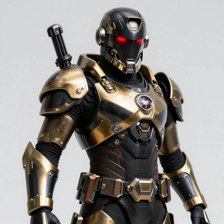 A futuristic soldier in ornate black and gold armor with glowing red eyes.