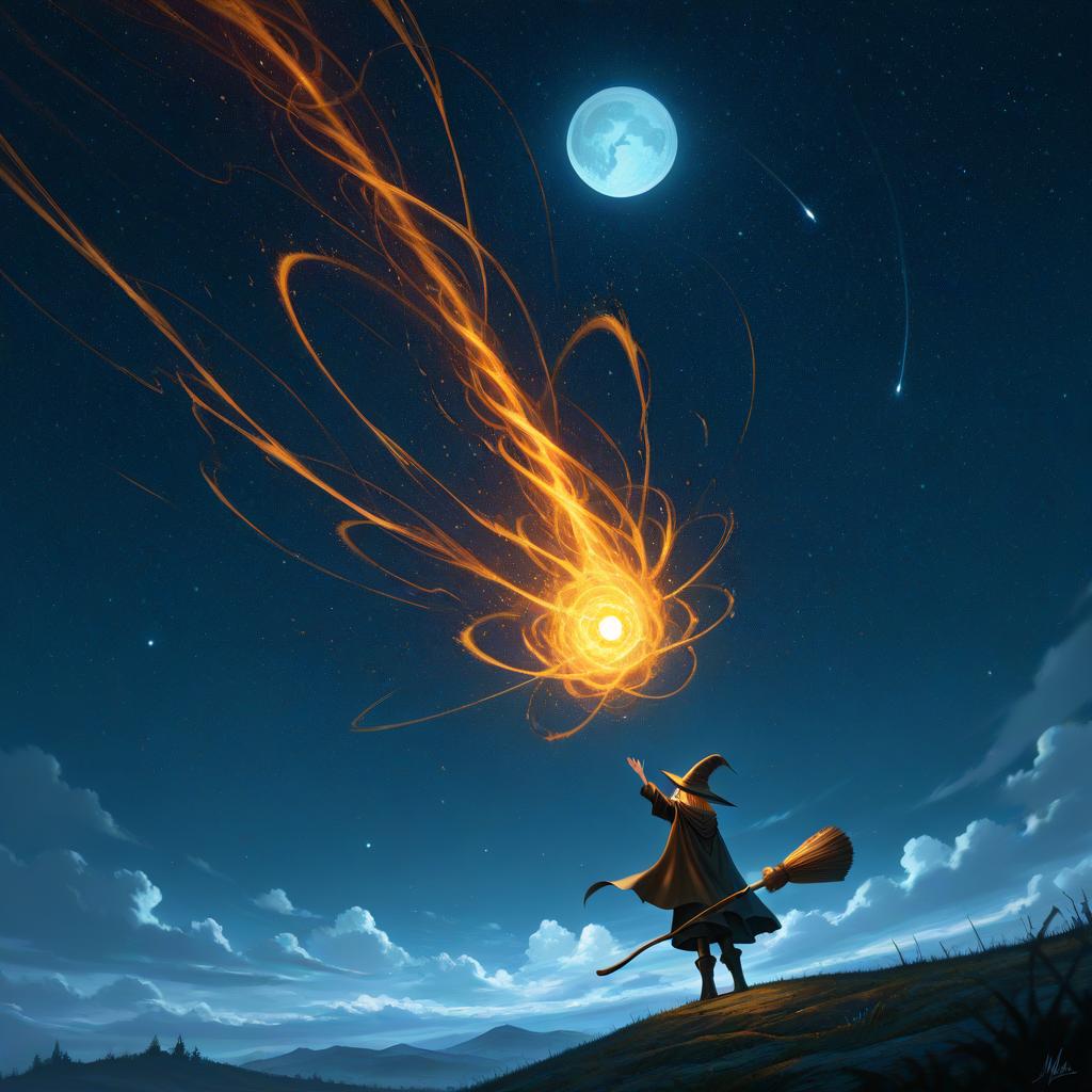 Masterpiece, best quality, ultra-detailed, illustration, 1girl, solo, fantasy, flying, broom, night sky, outdoors, magic, spells, moon, stars, clouds, wind, hair, cape, hat, boots, broomstick, glowing, mysterious, enchanting, whimsical, playful, adventurous, freedom, wonder, imagination, determination, skill, speed, movement, energy, realism, naturalistic, figurative, representational, beauty, fantasy culture, mythology, fairy tales, folklore, legends, witches, wizards, magical creatures, fantasy worlds, composition, scale, foreground, middle ground, background, perspective, light, color, texture, detail, wonder.