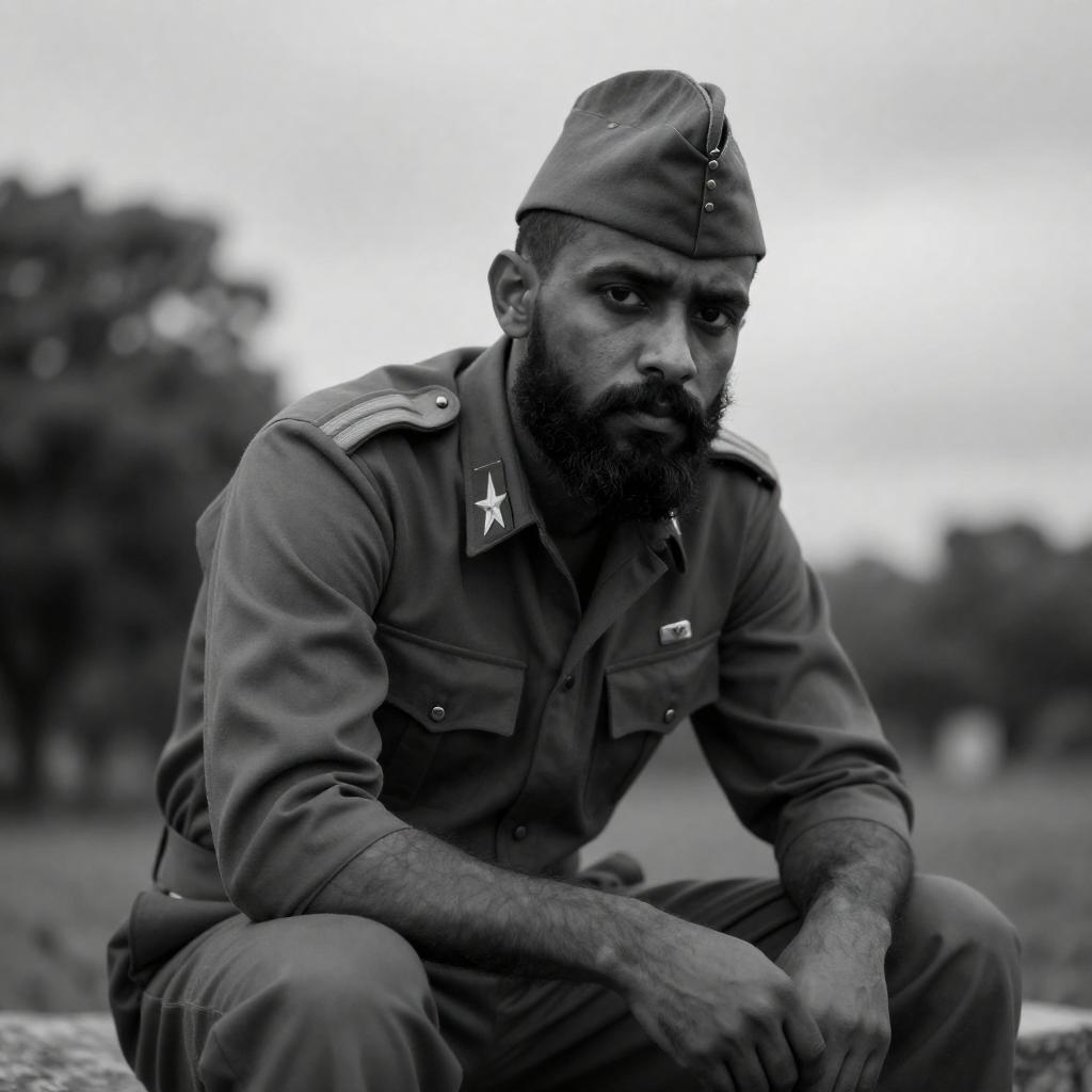 Photograph of a bearded man with a dark complexion, wearing a military cap and uniform with star-shaped insignia. He has a serious expression, leaning forward with one hand on his knee. Background includes trees and a cloudy sky. Blue monochrome tone.