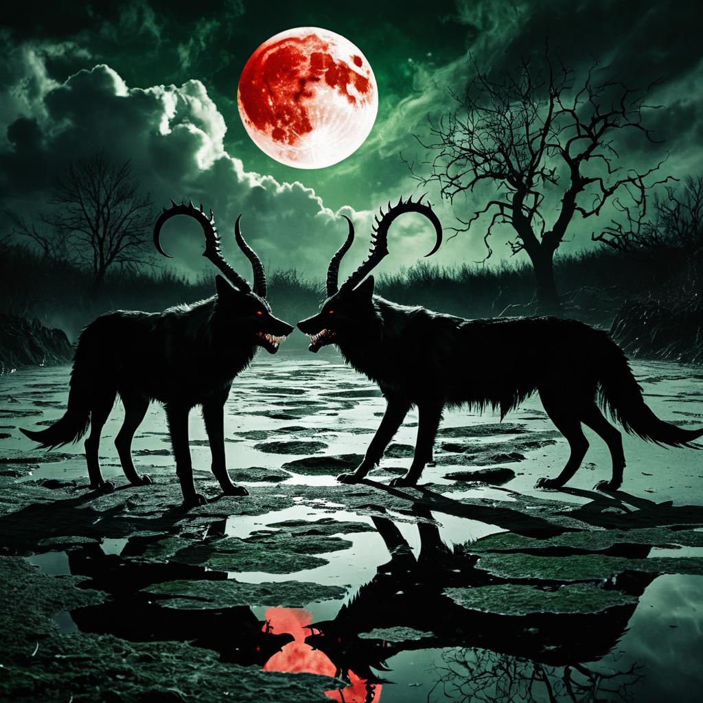 Dark fantasy image of two shadow wolves with glowing red eyes and demonic horns standing on cracked earth and shallow water, reflecting beneath a blood red moon. The scene is set in a sinister swamp landscape with poisonous green clouds, gothic atmosphere, and eerie shadowy tendrils. Leafless twisted trees and bats add to the haunted vibe.