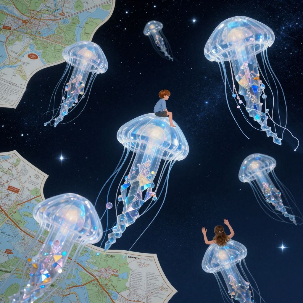 Children ride crystalline jellyfish through uncharted telescopic dimensions, guided by maps made of stardust and silence.