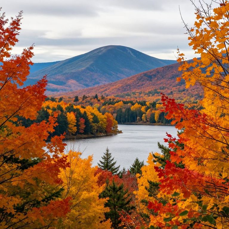 Distant mountains rise majestically above a serene lake, framed by vibrant autumn foliage in fiery hues of orange, yellow, and red, creating a breathtaking vista near Burlington, VT.