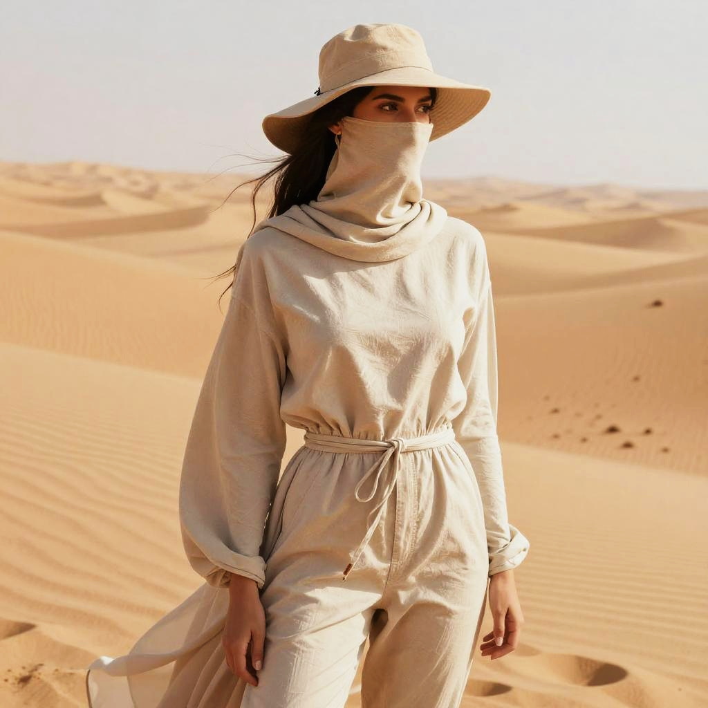 Desert garb fashion shoot, model in light breathable fabrics, sun hat and dust mask, vast desert horizon, warm muted palette, high fashion meets survival gear