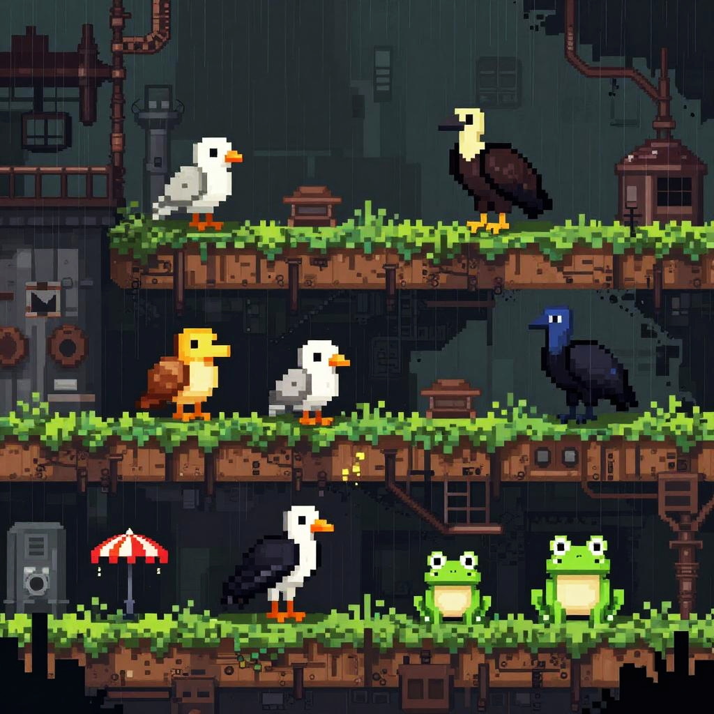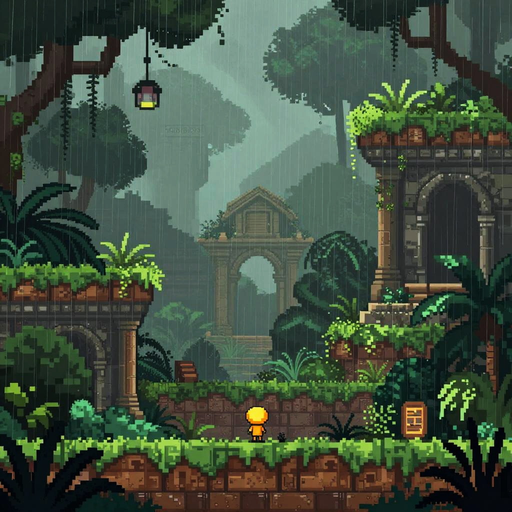 Pixel art portrayal of Rain World with dynamic rain falling over layered environments, emphasizing detailed textures on rocky platforms and bioluminescent plants, with the agile slugcat poised on a ledge, highlighting both danger and survival in muted, earthy tones.