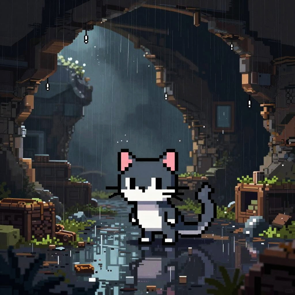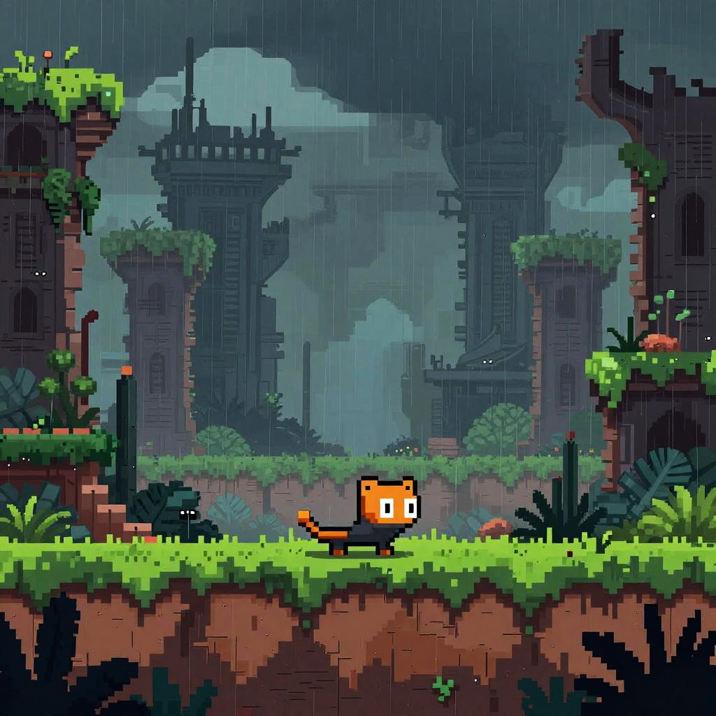 Pixel art of a rain-soaked forest with a small orange cat with a striped tail, standing on a mossy cliff, gazing at a red
