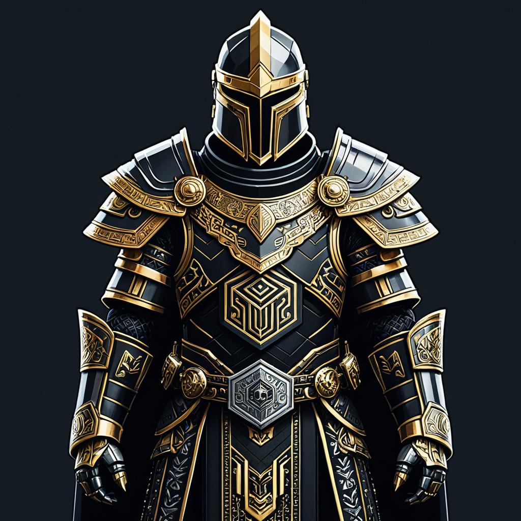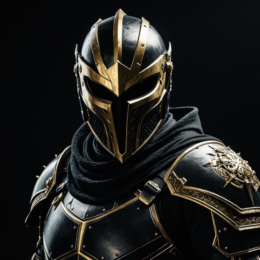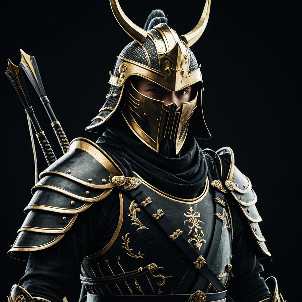 Gilded samurai archer with helmet and mask, all-black armor, intimidating face mask and helmet, plain black background, dark black theme, Zeiss, dramatic, complex details, professional photography, 8k, photo-realistic, octane rendering, global illumination, RTX ray tracing, VFX post-processing
