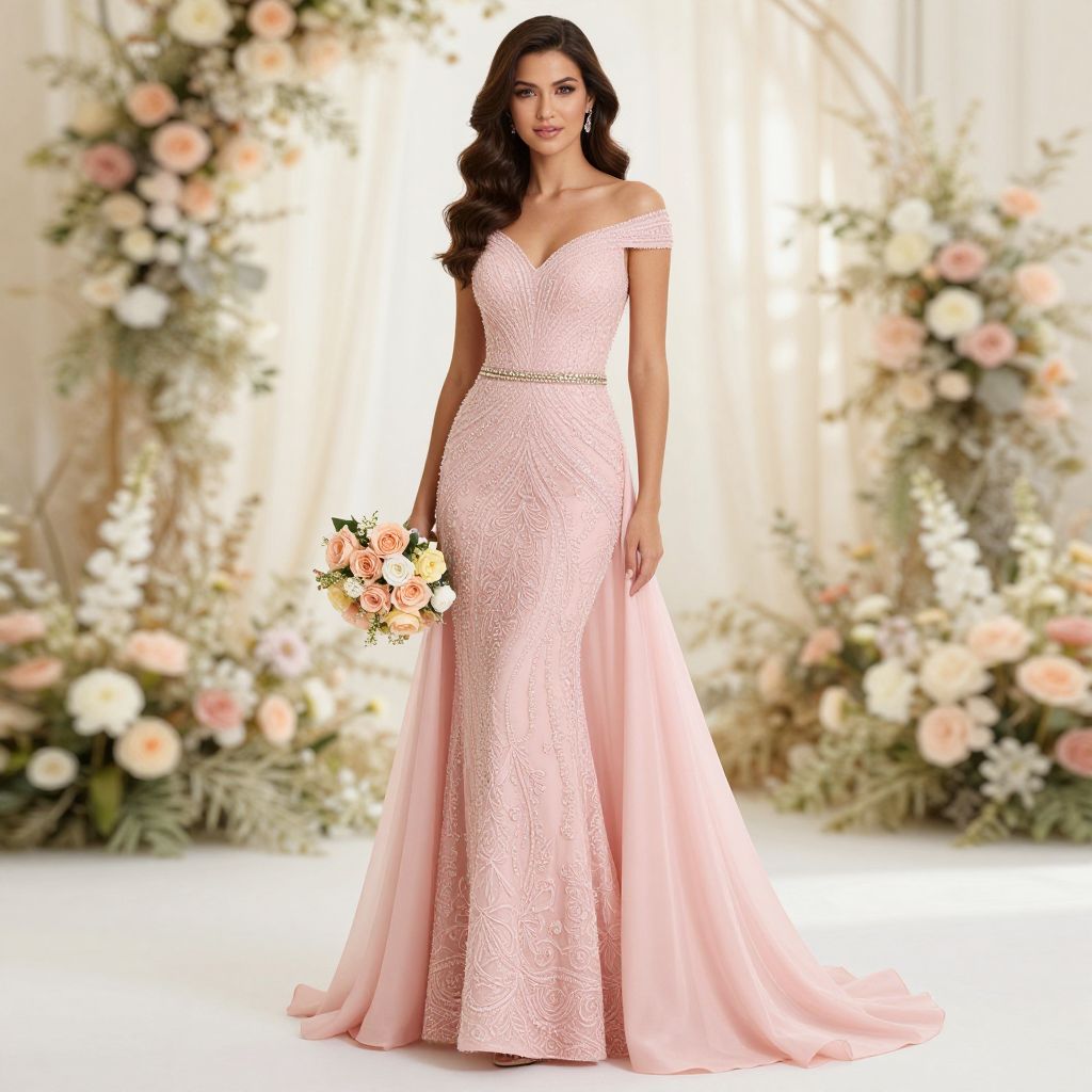 Photograph of a beautiful woman in an off-shoulder, pink lace wedding dress, holding a bouquet of white and pink flowers, standing in front