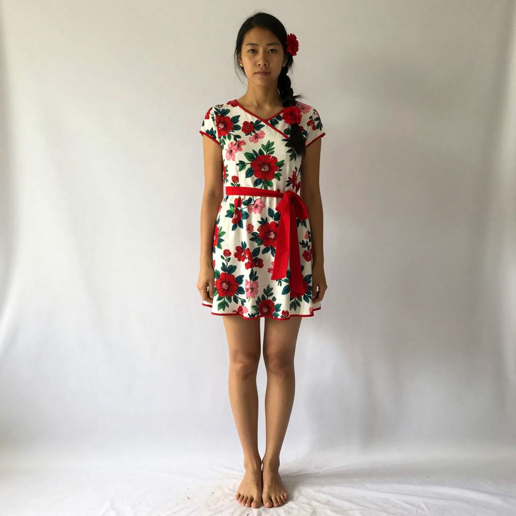 Frock short costume, photograph of an Asian woman, standing, full body, front view, wearing a short floral dress, red and pink flowers, white background, simple background, casual style, black hair in a side braid, red flower hair accessory, neutral expression, natural light, standing on both feet, dress has red trim and a red tie belt, plain white backdrop, model facing camera, slight shadow under dress, realistic style, soft lighting, everyday fashion, minimalistic setting