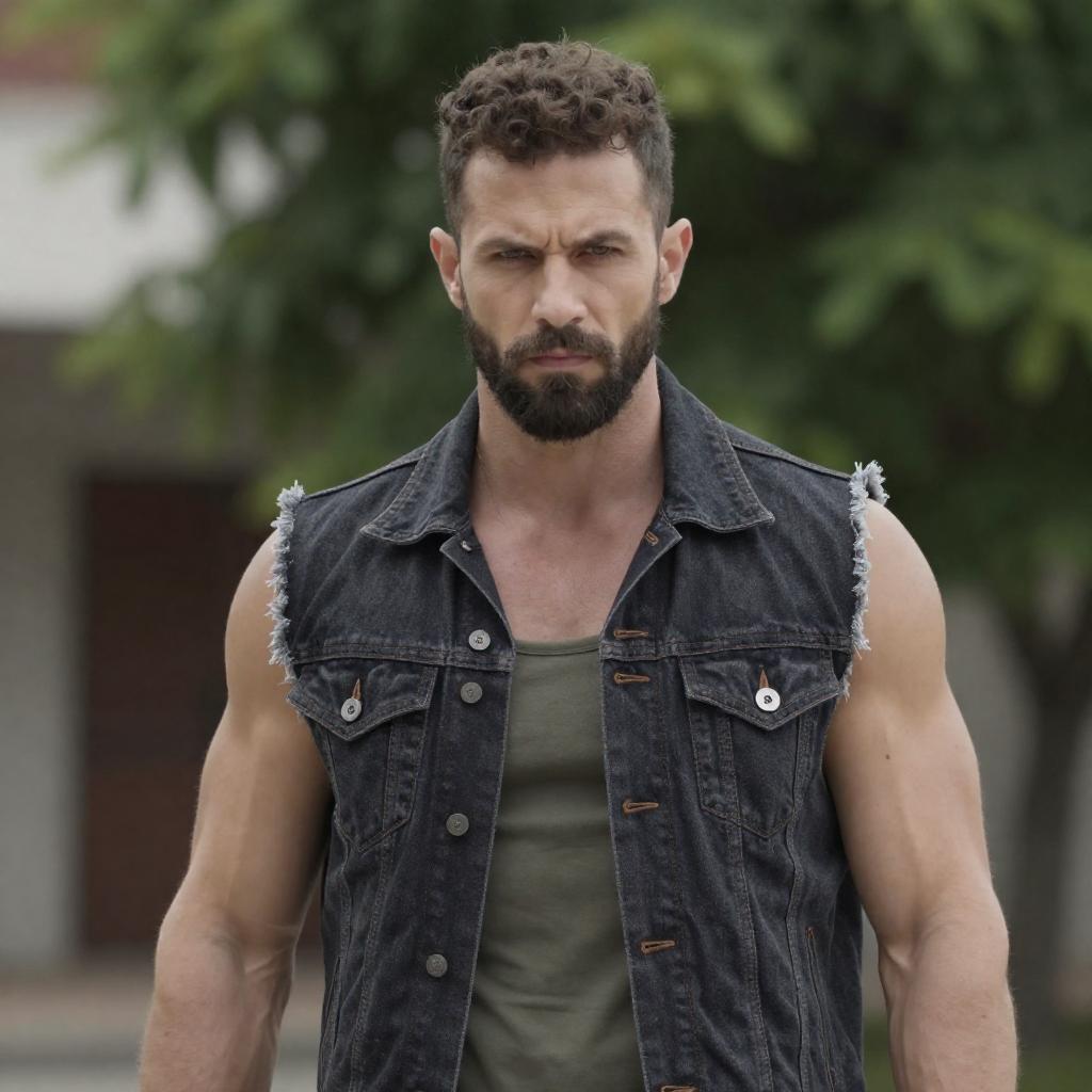 Photograph of a muscular man with short, curly brown hair and a beard. He wears a dark denim vest over a green shirt. Intense expression, green foliage in the background, blurred building behind him. Standing, facing camera.