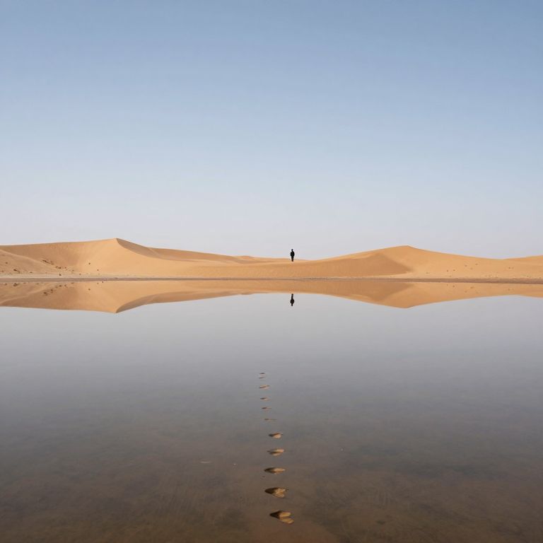 A desert of floating water mirrors reflects impossible skies, where real travelers leave behind phantom echoes of nonexistent footsteps.