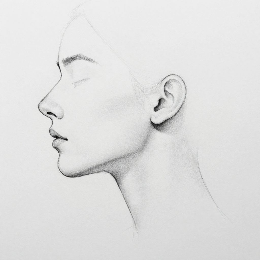 Jawline sketch featuring an angular profile of a woman, clean and precise lines capturing elegance and strength, subtle gradient shading around jawline and neck, artistic black and white drawing with fine detail