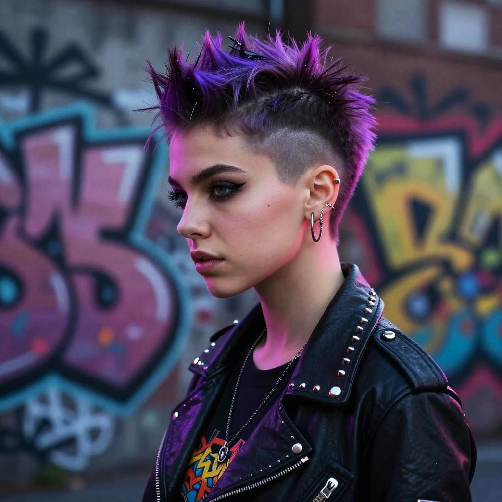 Punk bob haircut on a rebellious young woman in an urban street setting, vibrant neon colors, sharp edgy look, leather jacket with studs, graffiti background, moody lighting, cyberpunk aesthetic, detailed texture on hair and clothing